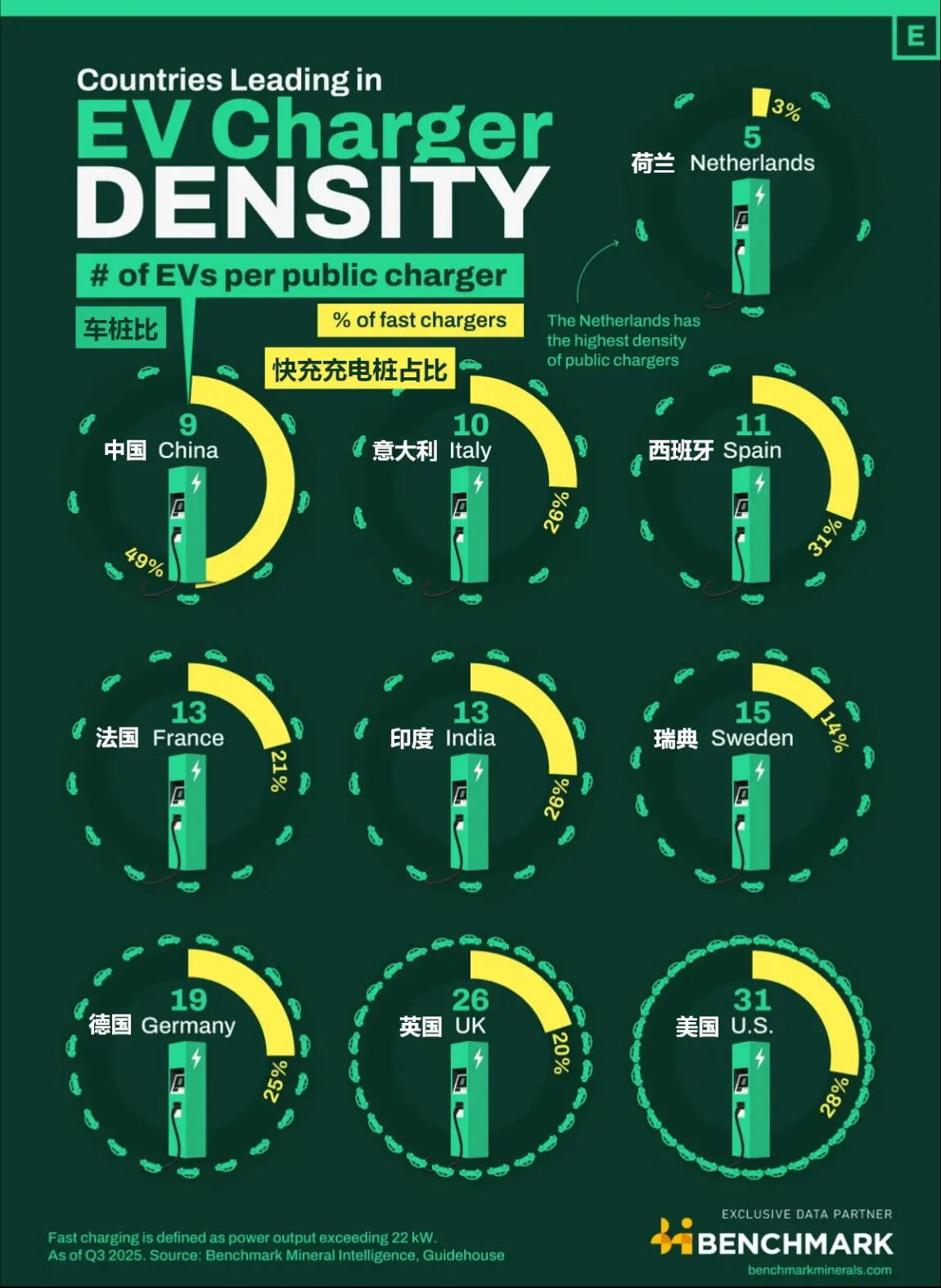 图解|机构:荷兰充电桩密度居全球首位,车桩比高达5:1 1月26日|根据Benchmark Mineral Intelligence的数据,下图根据电动汽车充电桩密度对主要国家进行排名(数据截至2025年第三季度)。荷兰以绝对优势位居榜首,车桩比为5:1,即平均每5辆电动汽车共享一个公共充电桩。然而,荷兰的快充桩占比较低,仅为3%。中国排名第二,车桩比为9:1。同时,中国在快速充电桩的部署方面遥遥领先,占比达到49%。意大利、西班牙和法国在欧洲国家中排名靠前,平均每10-13辆电动汽车共享一个公共充电桩。相比之下,美国排名落后,车桩比为31:1。