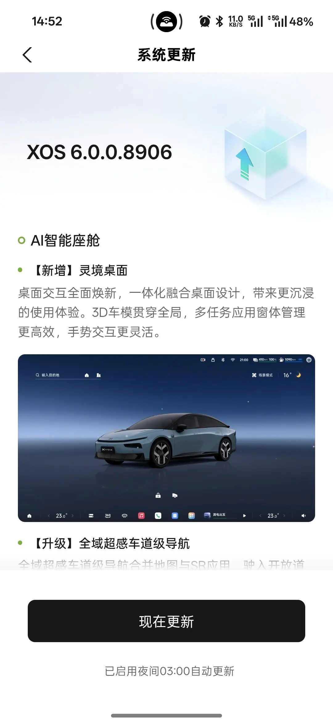 报名了测试版等待系统推送,网络通畅的情况下 25 分钟升级完成,途中车辆不能正常使用,这个切记哈。