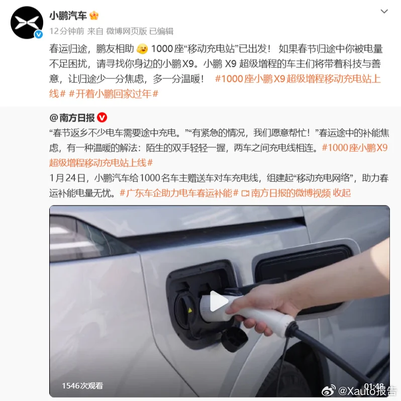 #一千座小鹏X9超级增程移动充电站# 关于我对小鹏移动充电站的观点和看法,首先肯定是对车主是方便的,因为是增程的移动补能电量肯定比一般的要方便,加油就可以,这样就加大了车辆的服务时间,还有就是这个是应急的对于突然没电,肯定要比叫拖车要方便,对于附近有充电站的地方,也多了选择,缺点就是可能增程发电,价钱可能比蓄电池供电的贵一点,不过这个问题对于应急不算什么。