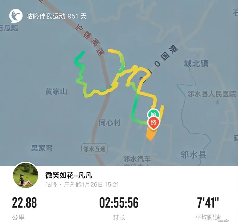 运动健康打卡,地点邻水县,室外跑步,总里程22.88公里,时间大概三小时。