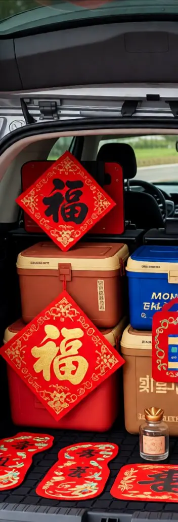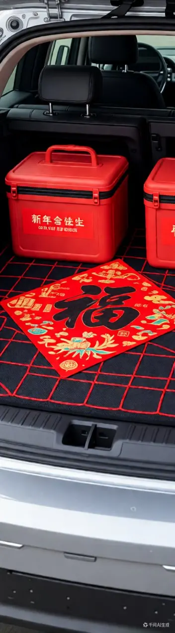 后备厢必备2个防水折叠箱,分类装干货和礼品,取放不乱。搭配红色刺绣“发财”字样的防水脚垫,耐脏又应景,上车仪式感拉满!