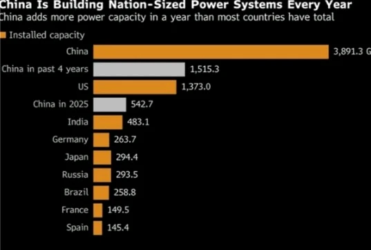 单就是中国2025年一年新增的5.43亿千瓦装机容量,不仅比印度截至2024年底全国累计的装机容量还要多,而且也远超德国、日本等经济体截至同期的累计装机容量。面对这样的成绩,美国媒体感叹不已,甚至调侃“芯片先进有什么用,没有电力什么都是白搭。”在美媒看来,尽管目前美国仍在人工智能竞赛中处于领先地位,但随着时间推移,这种优势将向中国转移。“我认为制约人工智能落地的核心因素是电力供应,”马斯克在最近参加瑞士的达沃斯世界经济论坛时就这样说道,“我们很快——甚至可能就在今年下半年——会出现造出的芯片数量超出我们供电承载能力的局面。”