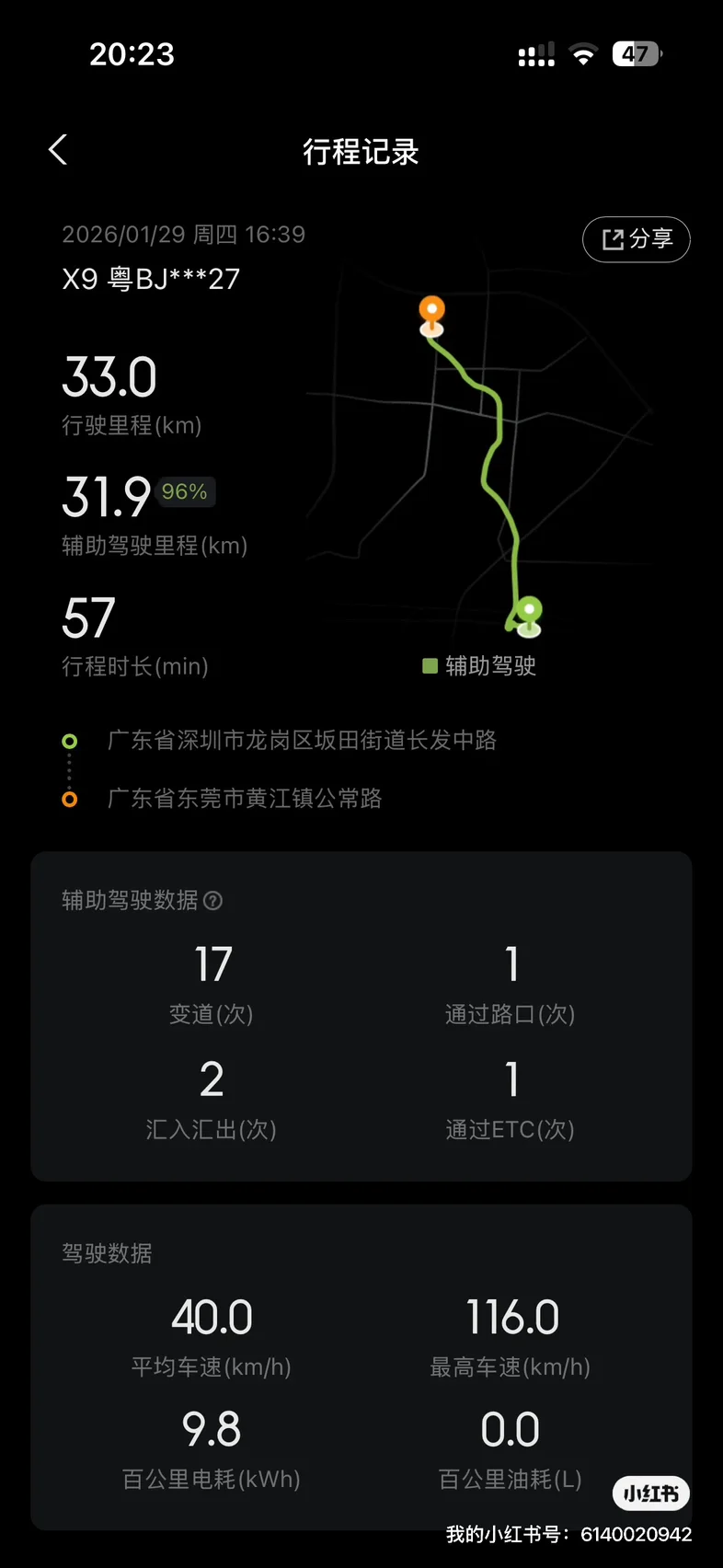 今天下午跑的,96%路段智驾,外加节能模式,大部分高速外加两次堵车,平时不堵车跑30多分钟,能耗15~17度电/百公里。今天跑50多分钟,能耗竟然低于10度电/每百公里,一样的路,路况也不是最好的,最近升级6.0系统。这能耗太低了,我都怀疑是不是错了。小鹏X9超级增程Ultra版本2.7吨7座。