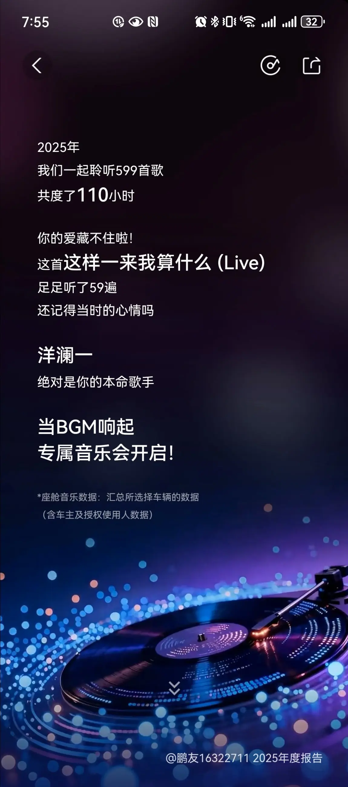 #全球鹏友接待计划# 提车以来,开车听歌是我最大的享受。110小时的陪伴,599首歌的共鸣,《这样一来我算什么》循环59遍,洋澜一的歌声是旅途中最懂我的BGM。 既有经典老歌的悠长韵味,也有轻快流行曲的活力节奏,还有带着烟火气的地方民谣。每一首旋律都像一个时间锚点,镌刻下每一段在路上的独家记忆。 当车轮向前,音符也跟着流淌,让这些声音陪我奔赴下一场山海。