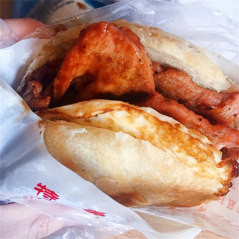 🍕 烧饼夹里脊:焦香烧饼裹嫩里脊,刷特调辣酱,蚌埠人早餐DNA动了!