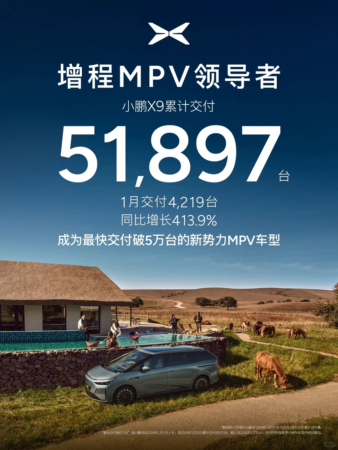 真香❗小鹏X9成最快交付破5万新势力MPV小鹏X9累计交付51,897台!成为最快交付破5万台的新势力MPV车型。同时,2026年1月交付量突破4,219台,同比增长413.9%。凭借空间、舒适和智能的全维实力,小鹏X9为每一个真实的家庭出行场景提供安心陪伴。感谢 50000+位鹏友的双向奔赴,新的一年,我们期待在智能家庭出行的路上遇见更多鹏友。
