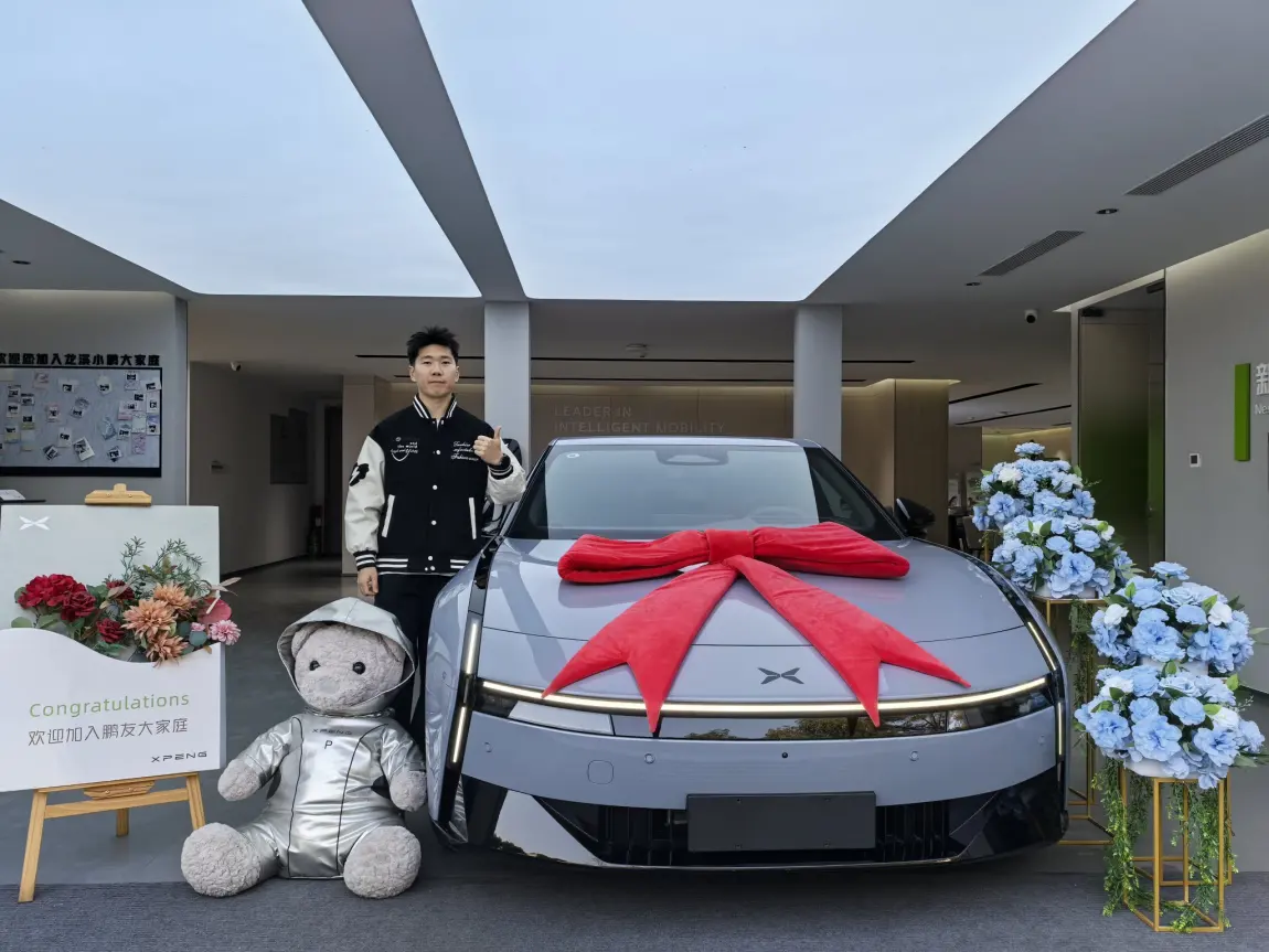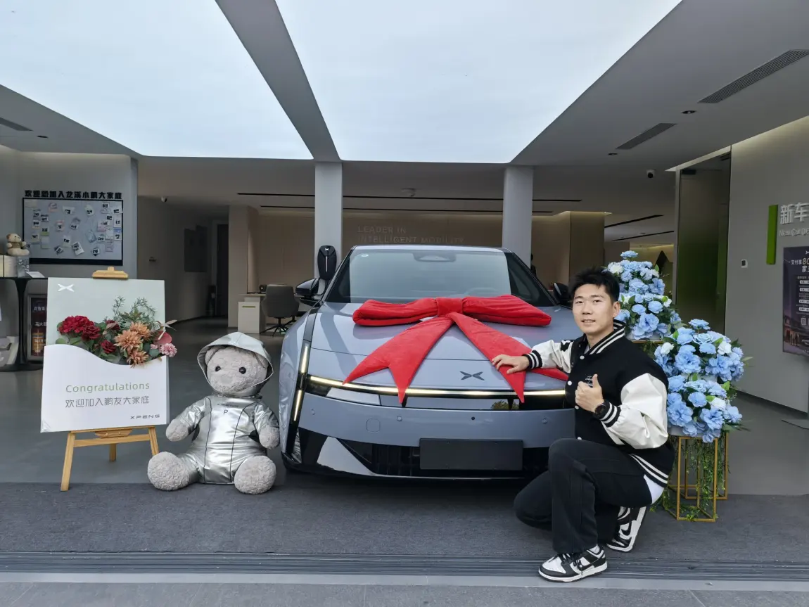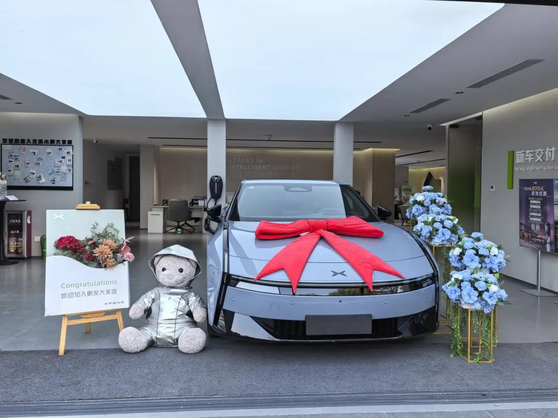当小鹏新p7的微星灰车身在交付中心的灯光下泛着细腻光泽,车头的大红色蝴蝶结像一团跳动的火焰,那一刻真的忍不住想笑出声。