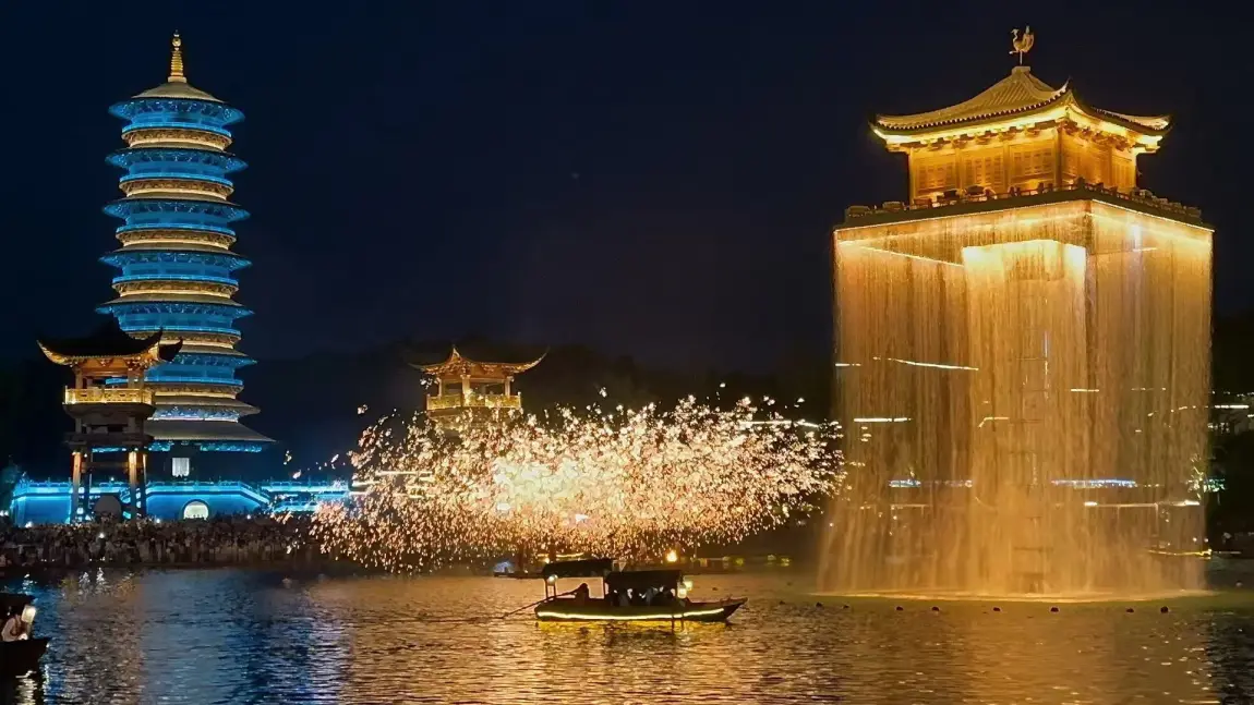 夜幕降临时,P7+载着我们抵达婺女洲。白墙黛瓦的徽派建筑在灯光中苏醒,汉服巡游的裙摆掠过青石板,悬浮金阁在湖面投下倒影。当非遗打铁花点燃夜空,1600℃的铁水化作金色雨幕,友人屏住呼吸:“The most breathtaking art I’ve ever seen.”而P7+的外放电功能,让我们在车旁煮茶赏花,把旅途的温暖延续到深夜。
