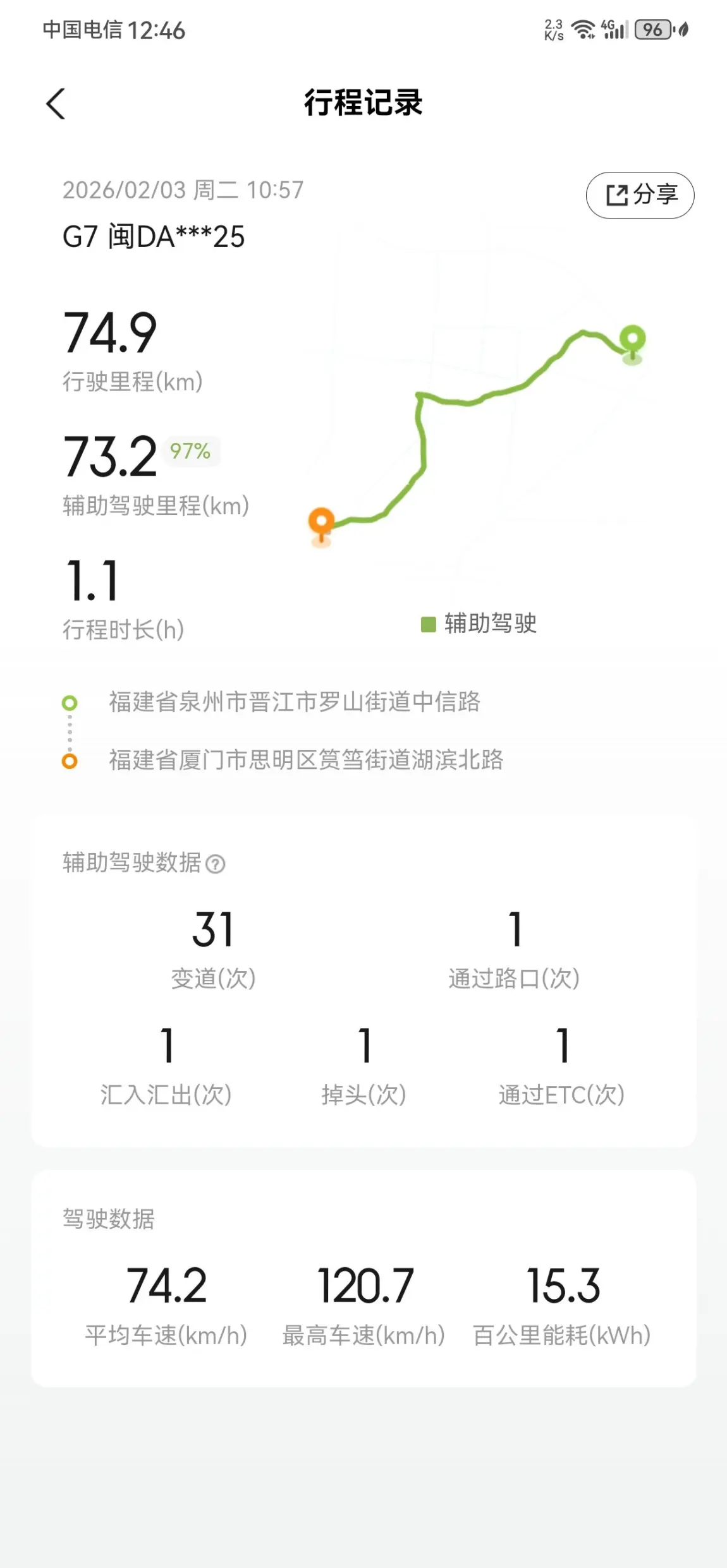 今天从晋江一路开回厦门,74.9公里的路程,97%都交给了小鹏智驾。握着方向盘,看着它稳稳完成31次变道、汇入汇出、甚至掉头,全程几乎不用我接管,真的太让人安心了!最高跑到120.7km/h,它依然保持着平稳和精准,我只需要偶尔留意路况,剩下的就是享受这段轻松的驾驶体验。15.3kWh的百公里能耗也相当给力,既智能又高效。 激动的心谁懂啊!🚗💨小鹏智驾,真的OK!