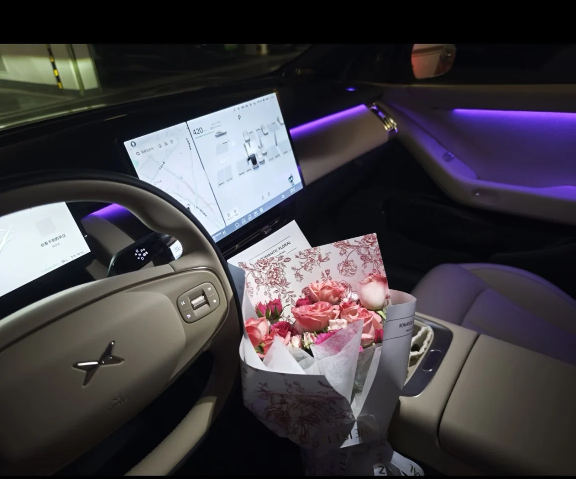 #藏在车生活里的浪漫# #小鹏汽车 #小鹏P7加见证的爱情故事 七夕开着小鹏P7+去赴约,车窗外的晚霞像打翻的蜜罐。车载香氛飘出淡淡的香薰味,配合着紫色的氛围灯,还有七夕准备的花,氛围感满满。餐厅里诱人的螺肉,和五年前第一次约会时一模一样。智能驾驶默默记住了所有转弯,就像我总记得他爱喝霸王茶姬奶茶。车顶的全景天幕亮起星星,原来最甜的浪漫,是有人愿意为你把生活调成最舒服的模式呀~