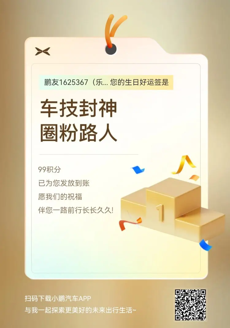 和小鹏相伴的第四个年头,居然收到了它的生日祝福,有点小惊喜~屏幕上跳出来的祝福动画,还有小P那声暖暖的“生日快乐”,突然觉得这不仅是代步的伙伴,更像个默默记挂着你的朋友。 四年里,它载着我跑过无数次通勤,也陪我去过大大小小的远方,安全感和便利感早就融进了日常。这份突如其来的心意,让今天多了份特别的甜,期待接下来的日子,继续一起往前呀~🚗💨