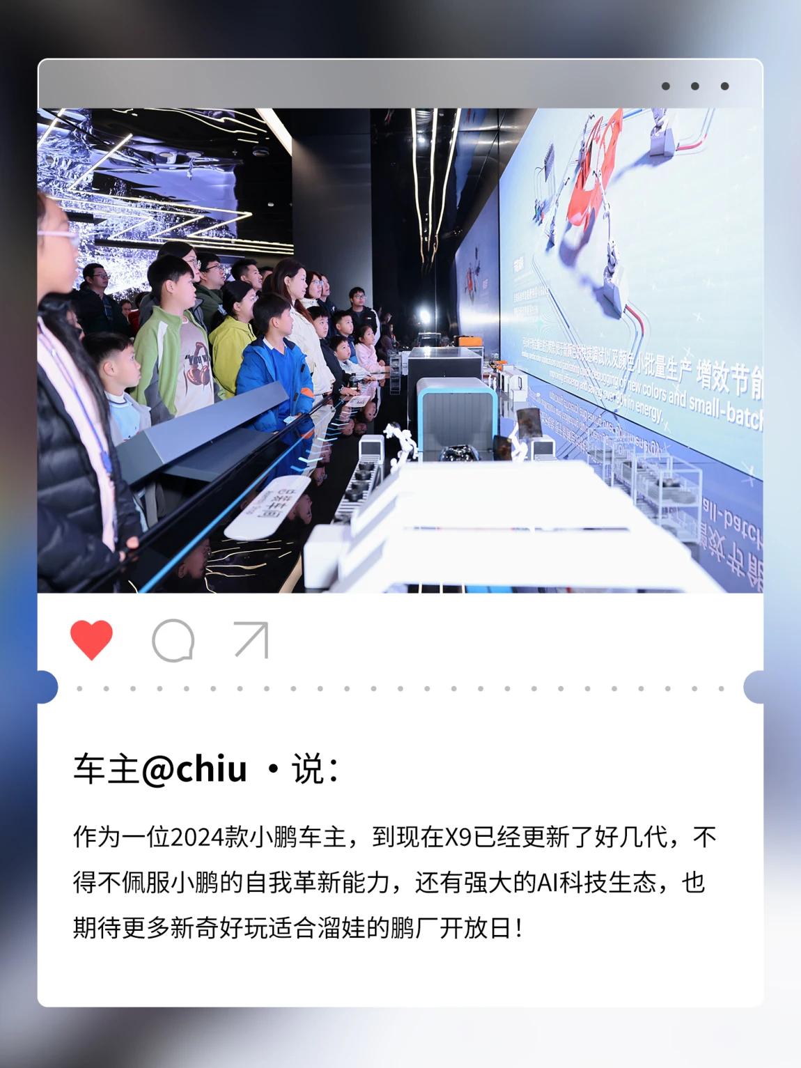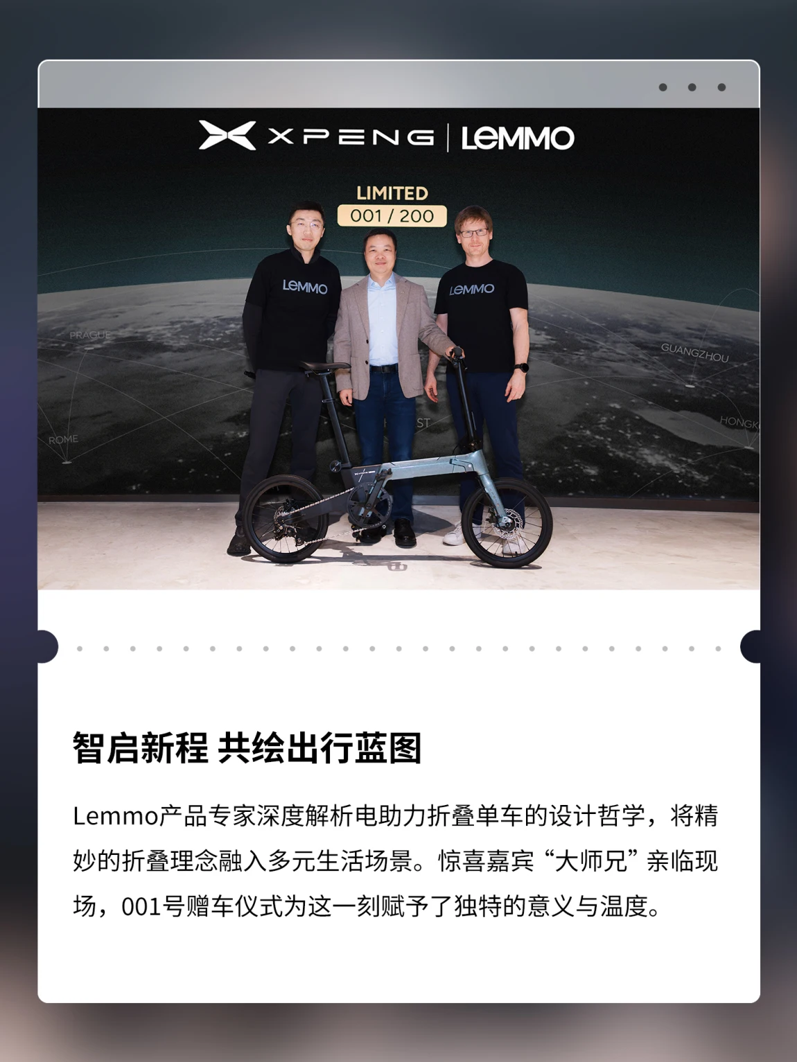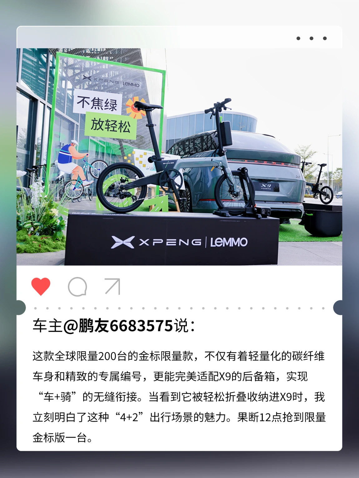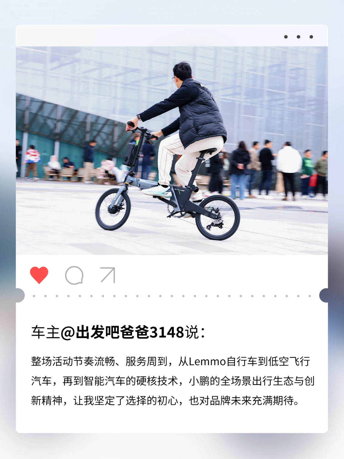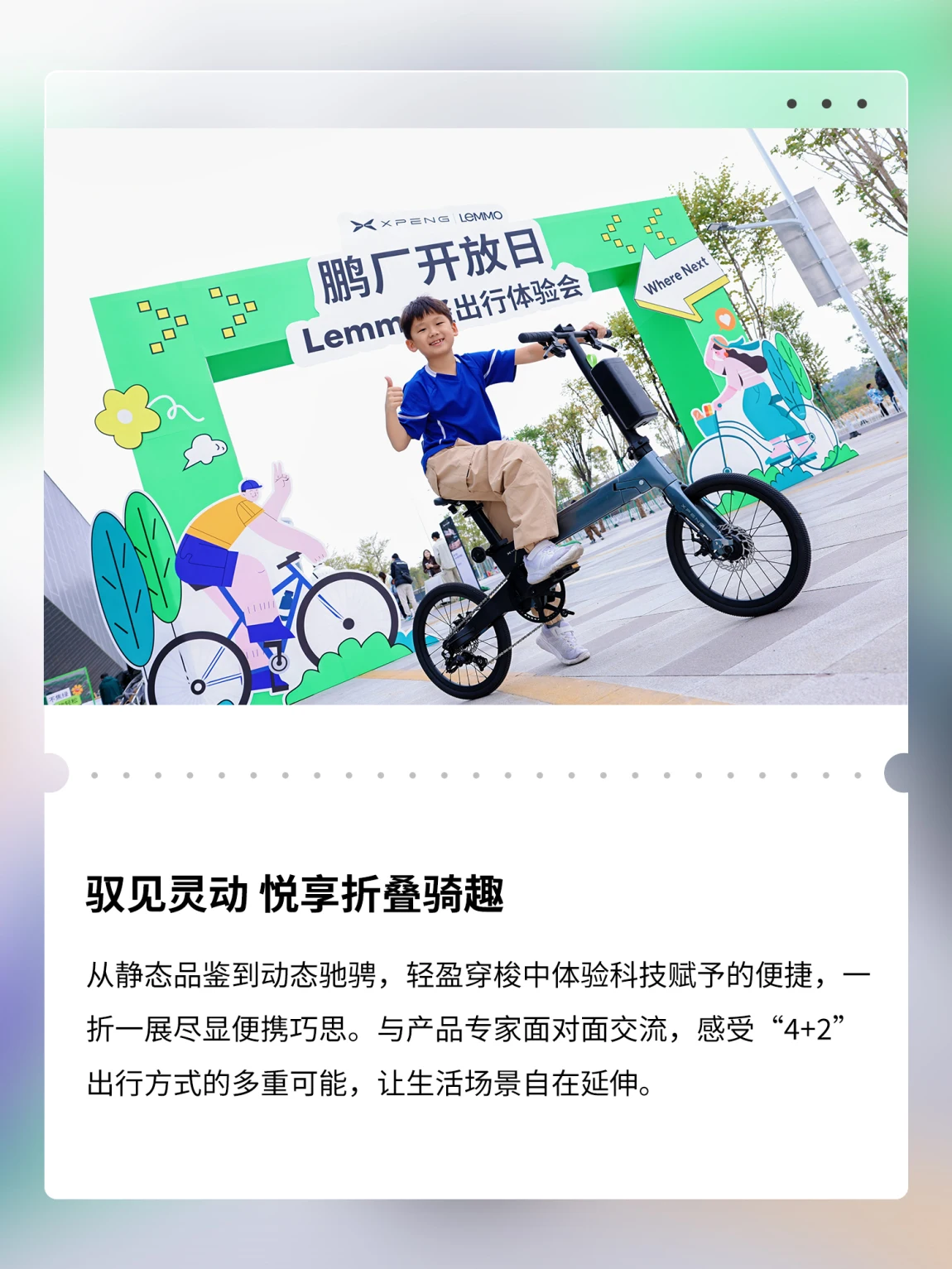 上周六,在小鹏科技园举办的「鹏厂开放日X9专场——Lemmo轻出行体验会」圆满落幕✨在这场特别的活动中,鹏友们一同畅游未来出行图景:🚗走进企业与汇天展厅,近距离感受从地面到空中的全场景出行生态蓝图🚲Lemmo产品专家深度解读折叠美学,让巧思设计融入城市街景与自然远方📷惊喜嘉宾“大师兄”亲临现场,001号赠车仪式定格温暖时刻🚴♂️动态试骑点燃热情,一折一展间尽显灵动便携,沉浸体验“4+2”出行新方式科技赋能出行,灵感连接生活下一程,期待与更多鹏友继续同行🌟