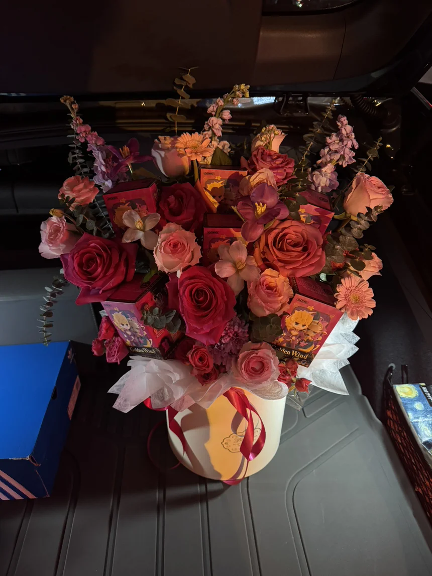 对象是 jojo 厨,那时候还没处成对象的某个周五下班,约到了晚上一起吃饭,立刻带着提前准备的jojo盲盒冲去花店包好了花,放在 p7 后备箱,不过抱抱桶型的花实在太大了,最后只能放后备箱的下沉空间,而且还要载她去吃饭不能提前暴露。一路上她问我怎么车里有股新鲜花材的味道,我还一直在隐藏😂,而且害怕花会倒,一路上开得很稳,不过不愧是 新 p7 底盘,路上虽然很多修路坑坑洼洼,最后还是安全到地花也没有倒掉。