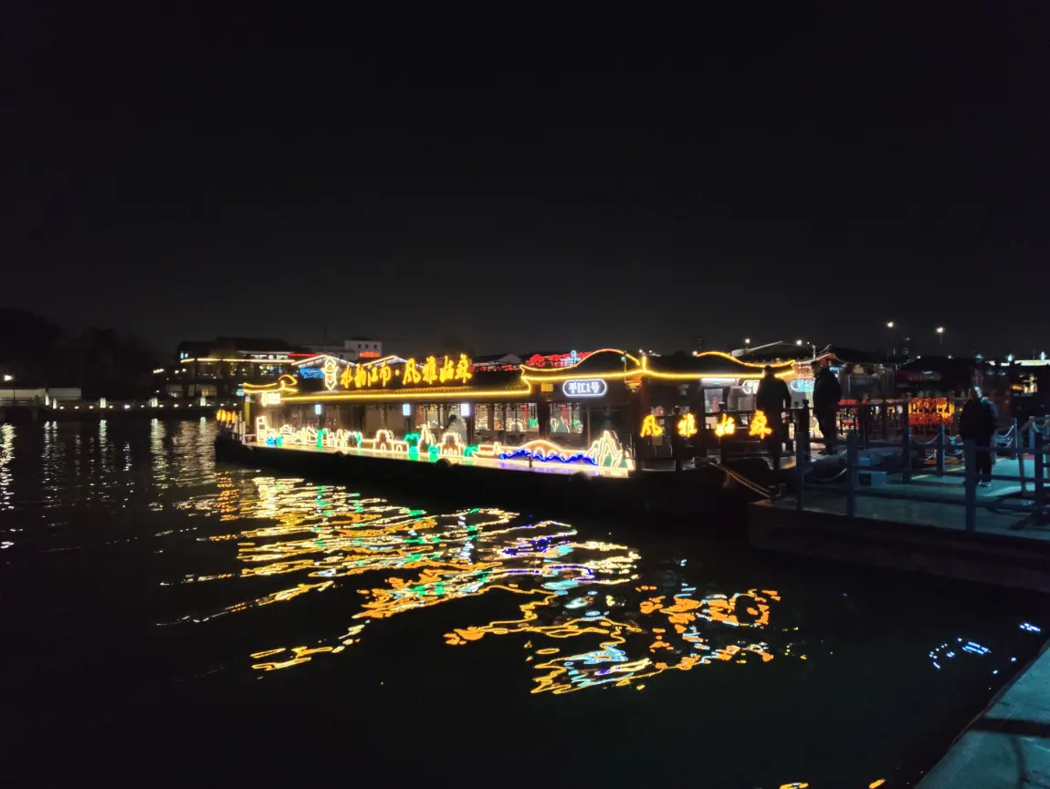 夜游船:桨声灯影,梦回古渡。暮色四合时,来到新市桥码头,乘坐古运河尊享夜游班船 。登船落座,备好茶水与精致小吃,听听评弹选段,身着素雅旗袍的艺人轻拨琴弦,一曲《春江花月夜》缓缓流淌。河面平静如镜,倒映着岸边的红灯笼与亭台楼阁,船桨划动时,水波荡漾,光影破碎又重组,恍若穿越千年。