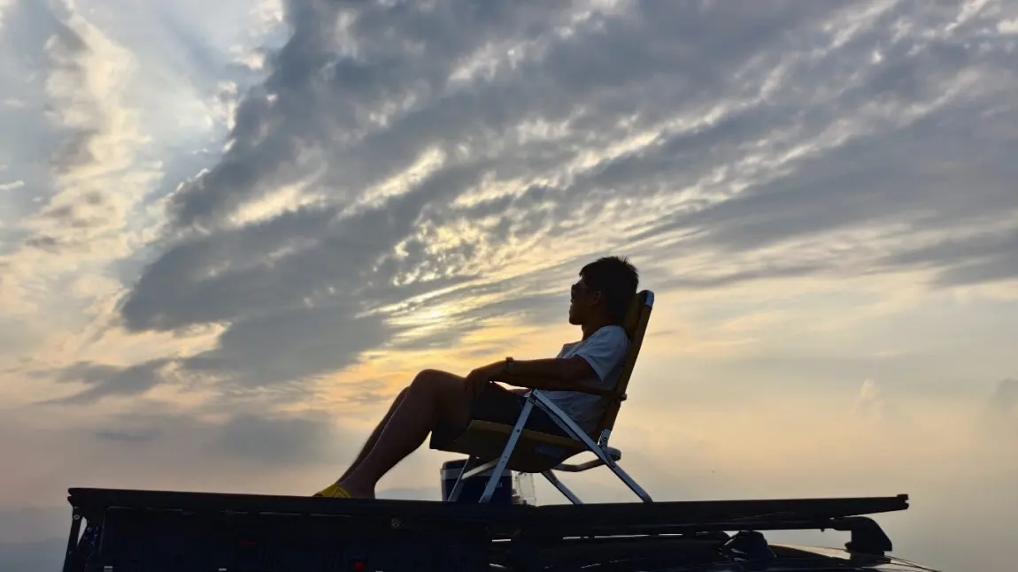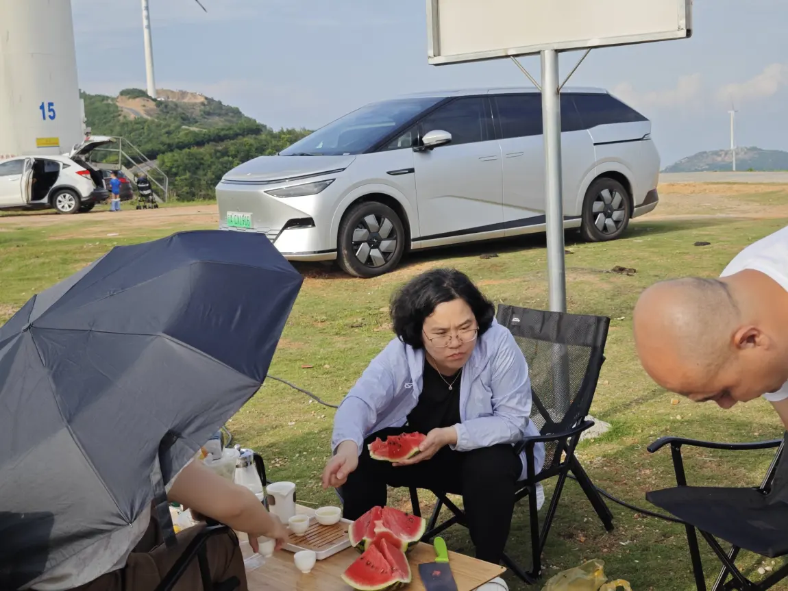 抵达山顶,巨大的风车缓缓转动,仿佛在与落日低语。夕阳将天空染成温柔的橘红色,余晖洒在佳人的笑脸上,也洒在我们的爱车上。一家人围坐在一起,吹着晚风,看着太阳慢慢沉入云海,时光在此刻变得缓慢而写意。