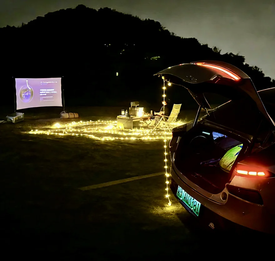 确定关系后,我开始计划求婚。选了第一次自驾去过的露营地。那天周五下班,我开着P7带她过去。后备箱里藏着戒指、串灯和投影仪。到了地方,我借口拿东西,把串灯挂在车尾帐篷上,又用移动外放电源点亮了灯。等她反应过来,我已经单膝跪地。她点头时,眼里有光,和那天车窗外的星星一样亮。