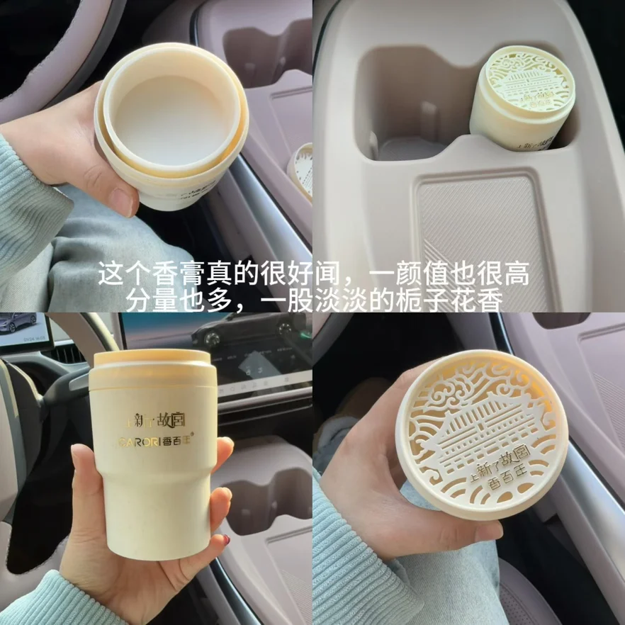 1.这个小香膏的话真的很好闻颜值也高,刚提车的话车里有股难闻的味道,自从放了这个香膏,每次一上车就是一股香香的味道