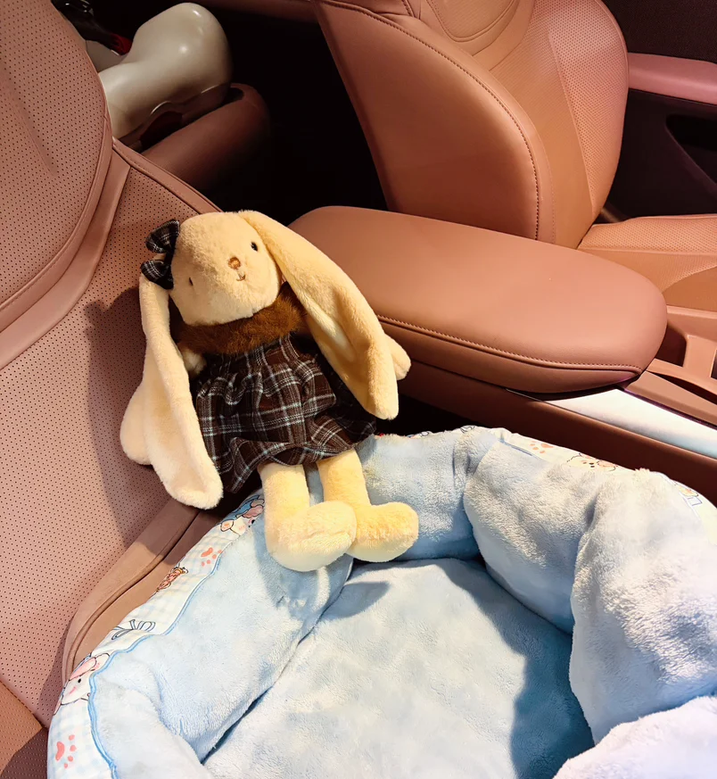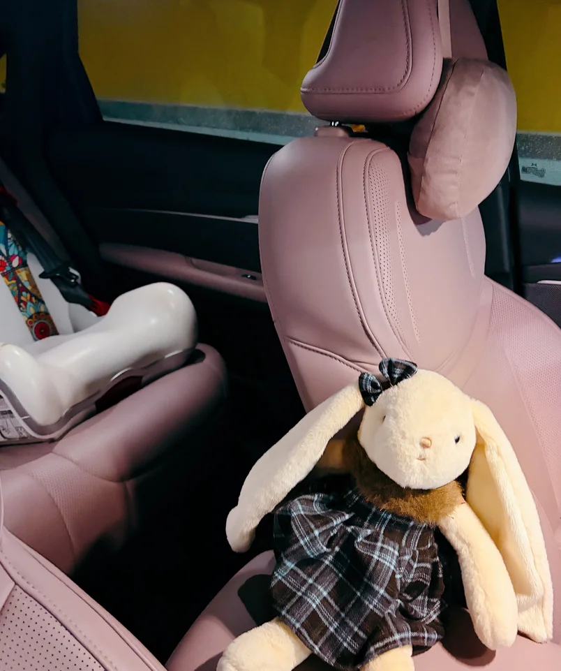 再后来,宝宝的到来让这个家更完整了。我们把安全座椅稳稳地固定在后座,和小狗的窝挨在一起。粉棕拼色的座椅上,除了陪伴我们很久的兔子玩偶,又多了宝宝的安抚巾和小毯子。