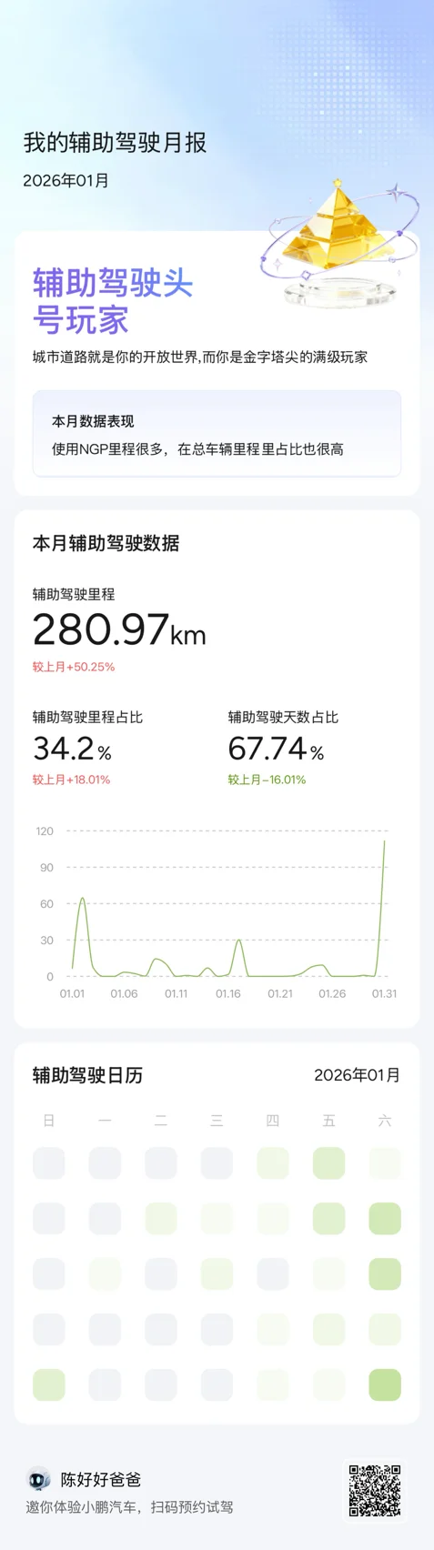小鹏汽车的NGP智驾系统用起来体验特别好,实用性拉满!如今我开启智驾的里程数每个月都在稳步增加,日常上下班的通勤路,基本全程都靠它来辅助驾驶。不管是道路跟车、平顺变道,还是应对常见的通勤路况,它都表现得很稳定,不仅大幅降低了驾驶的疲劳感,还让日常出行变得更轻松省心,真心觉得这款智驾系统适配通勤场景的体验超棒,特别是HUD的光毯模式