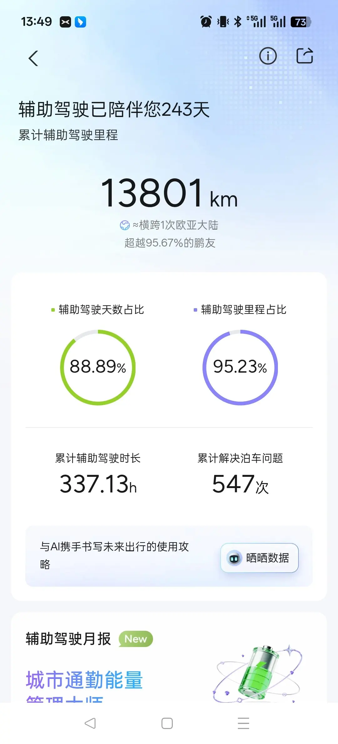 提车8个月,智驾13801公里,智驾率95.23%,还有谁???8个月了,充电速度还是那么快,续航里程还是553km,剩余电量5%了也不焦虑,因为我知道,到处都有充电桩~自从有了它,中午不用趴办公桌睡了,睡眠质量提升工作效率提高,周末不用加班想去哪里就去哪里,找个有山有水的地方停车露营,打开大床模式,听着流水、数着星星入眠~