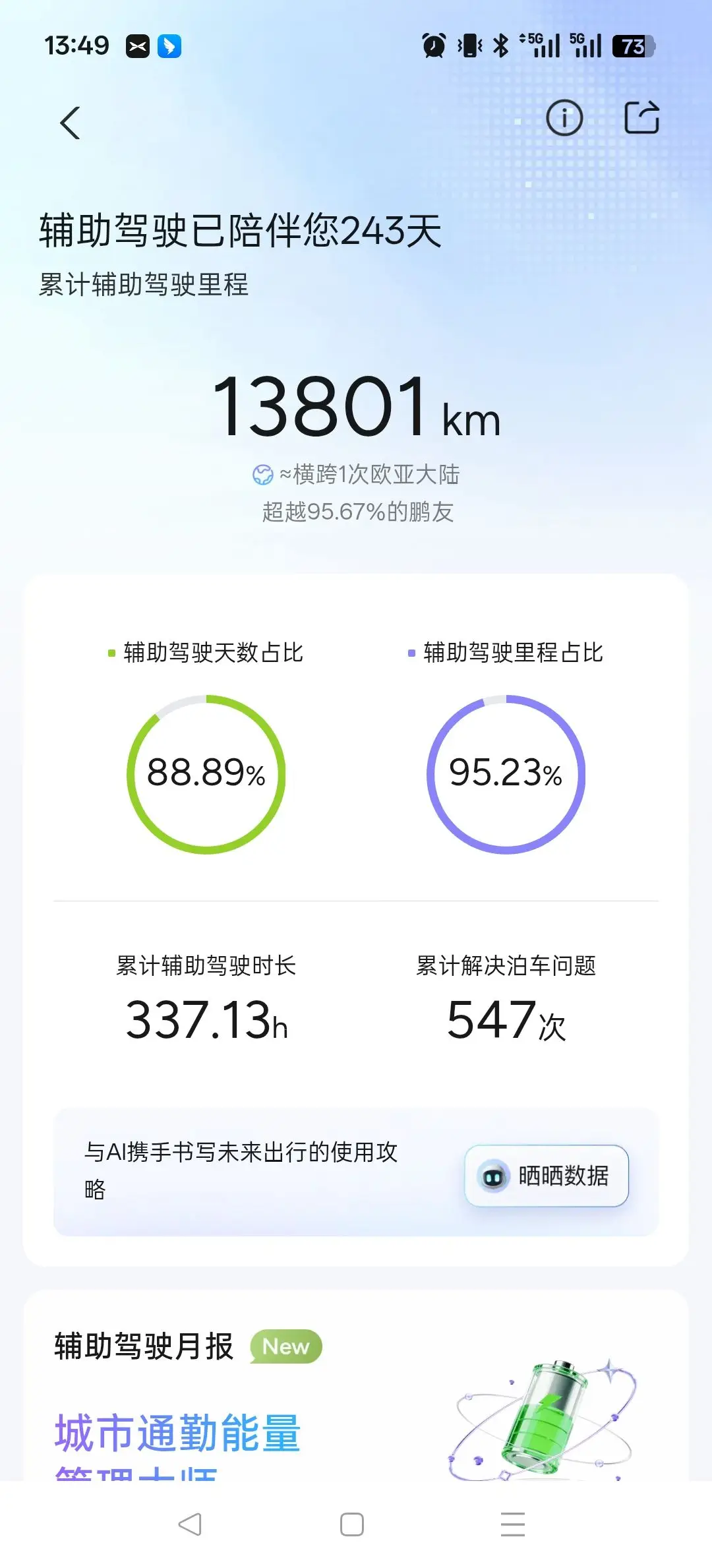 提车8个月,智驾13801公里,智驾率95.23%,还有谁???8个月了,充电速度还是那么快,续航里程还是553km,剩余电量5%了也不焦虑,因为我知道,到处都有充电桩~自从有了它,中午不用趴办公桌睡了,效率提高周末不用加班,想去哪里就去哪里,找个有山有水的地方停车露营,听着流水、看着星星入眠~
