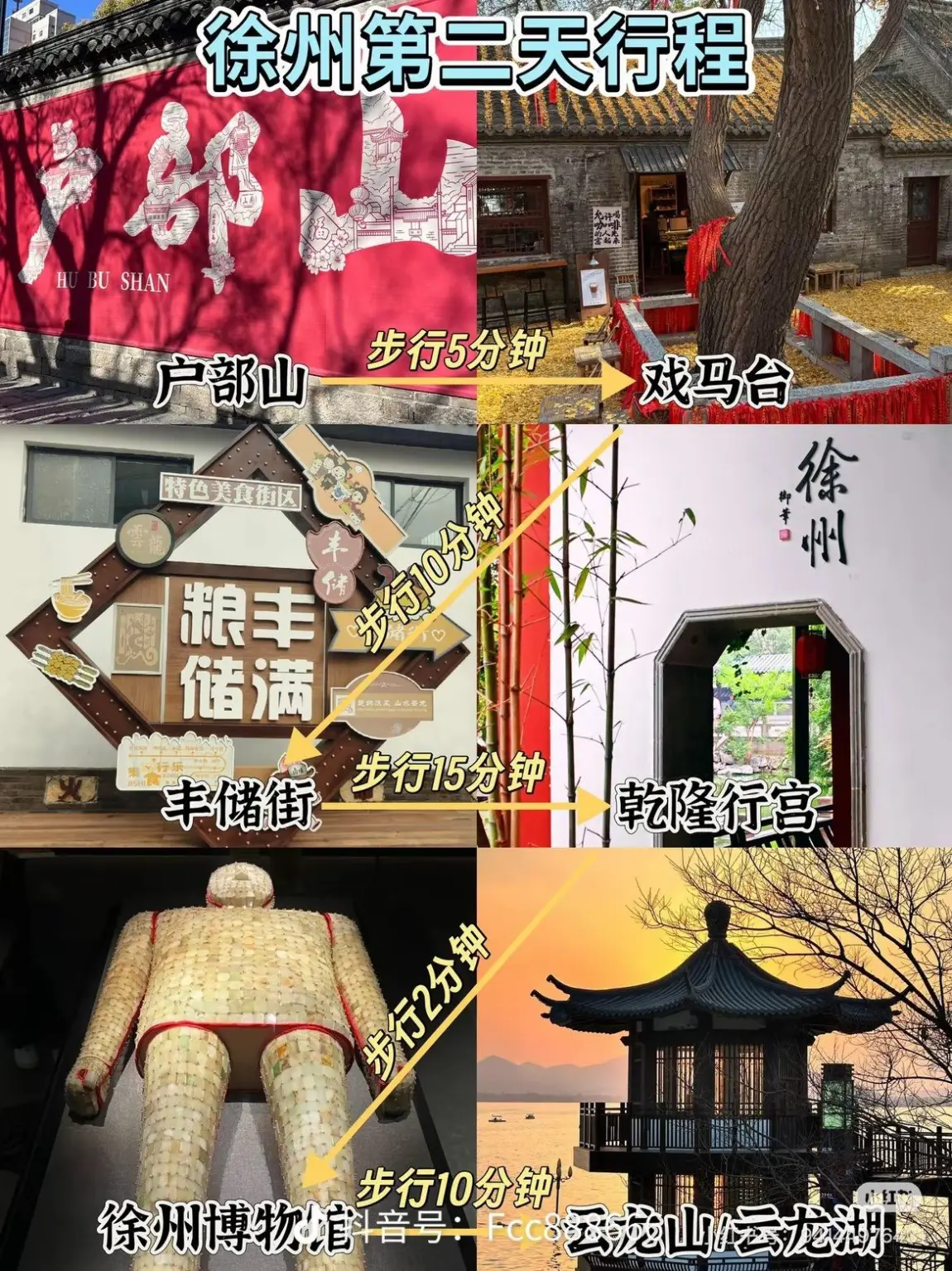 第二天继续自驾前行,漫步户部山、戏马台,触摸千年历史的厚重;在丰储街逛吃地道美食,走进乾隆行宫品读历史,打卡徐州博物馆感受文脉传承,最后去云龙山、云龙湖看山水相依,赏落日余晖。