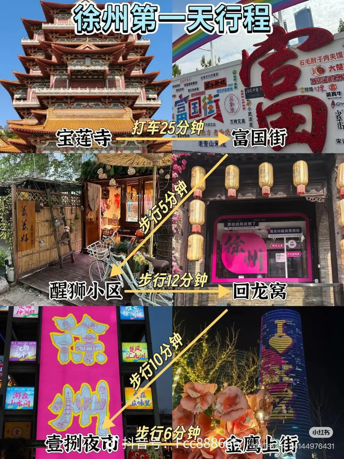 第一天自驾启程,打卡气势恢宏的宝莲寺,在红墙古建里感受禅意古韵;接着逛富国街、回龙窝,穿梭在老街小巷里,尝遍徐州特色小吃,打卡新潮又复古的醒狮小区,傍晚奔赴壹捌夜市、金街上街,沉浸式体验热闹的市井烟火,感受徐州的夜生活浪漫。
