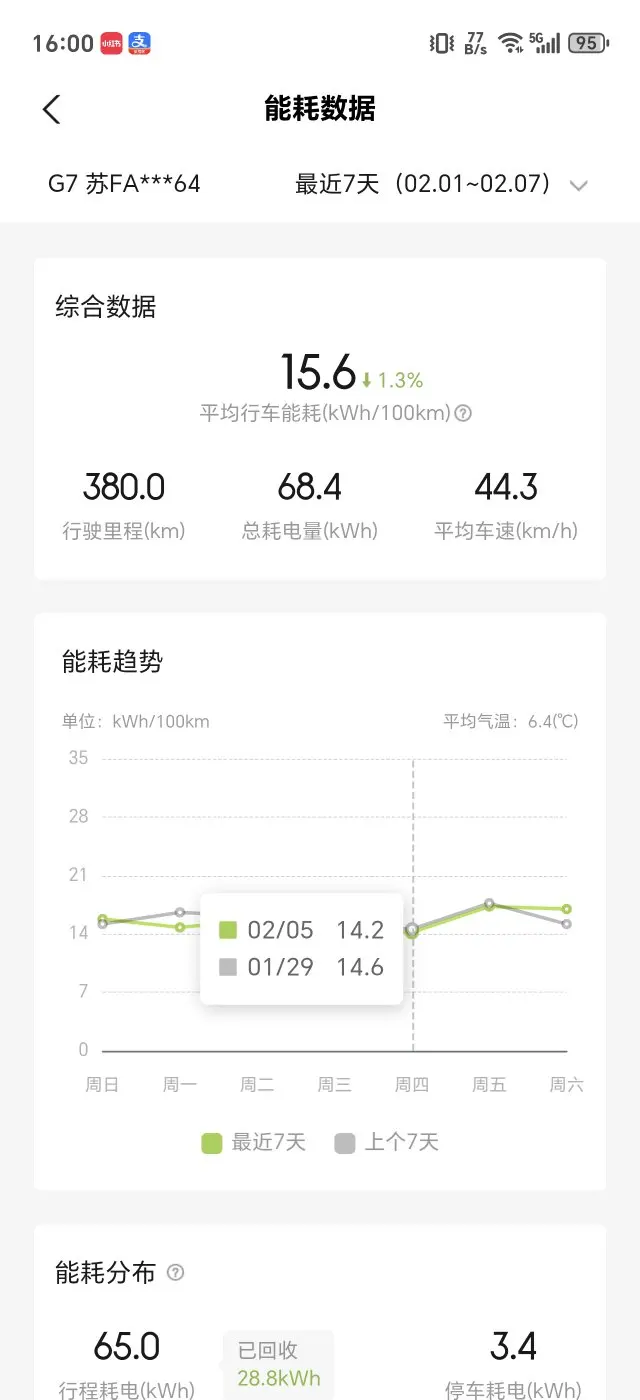 最后一段进城遇上晚高峰,走走停停的路况下能耗升到17kWh/100km,但座椅加热和空调开足也没太增加负担。看着能耗曲线起起伏伏,反而觉得G7的能耗管理相当智能。