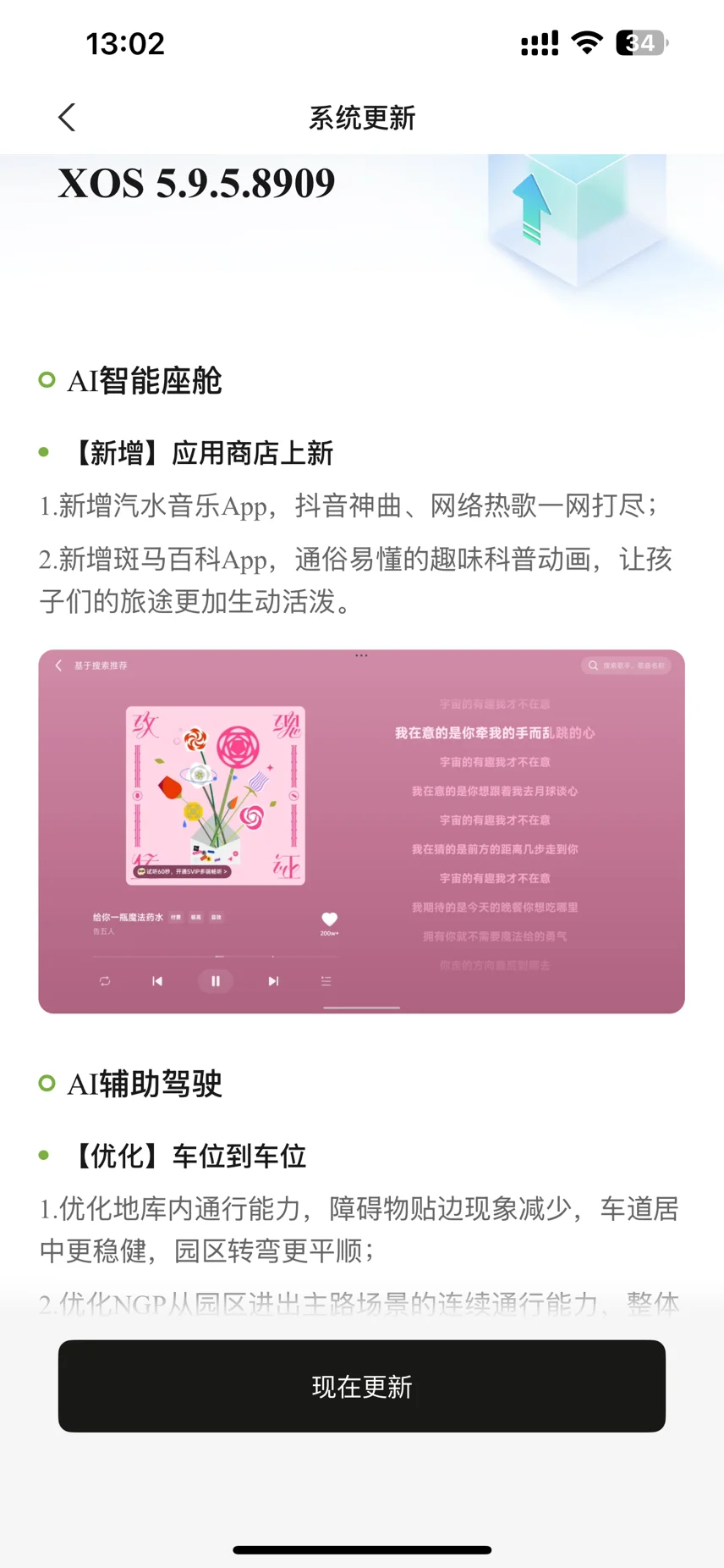 终于在年前更新了,还好不是最后一批,等的都烦了,更新了我喜欢的汽水音乐,音质都不一样了,新的一年里祝小鹏汽车及各位小鹏友们,开开心心过大年,顺顺利利回老家。(´・ω・ʃƪ)🧨