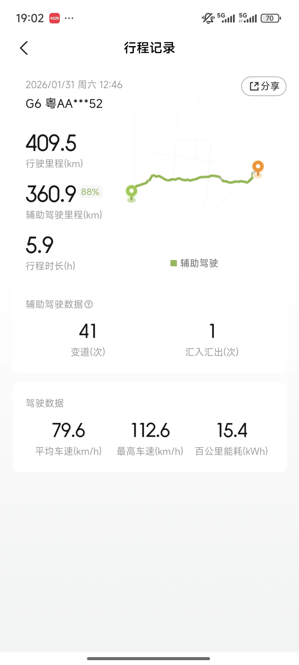 👇📅行程时间:2026/01/31周六📍车型:小鹏G6科技版625max 🗺️路程:约409.5公里⏱️用时:5.9小时