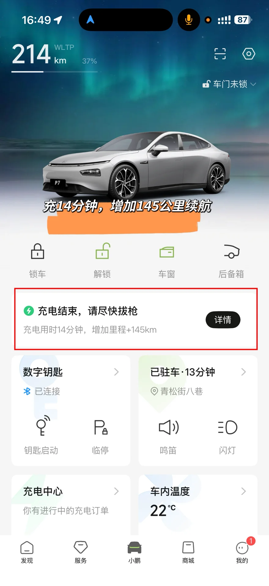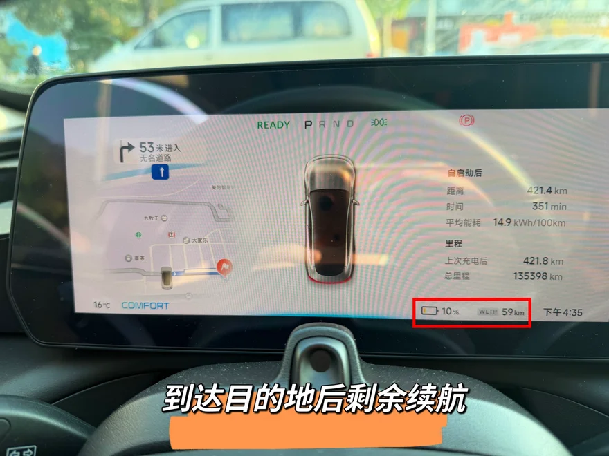 到达目的地“小鹏S4超快充佛山顺成顺融城站”后,正好是下午4点35分,P7仪表盘显示行驶351分钟,这段长途一共行驶了421.4公里。WLTP电量剩余59公里,所以WLTP电量一共消耗了515公里。续航八二折。这样的续航达成率还算是比较满意的。