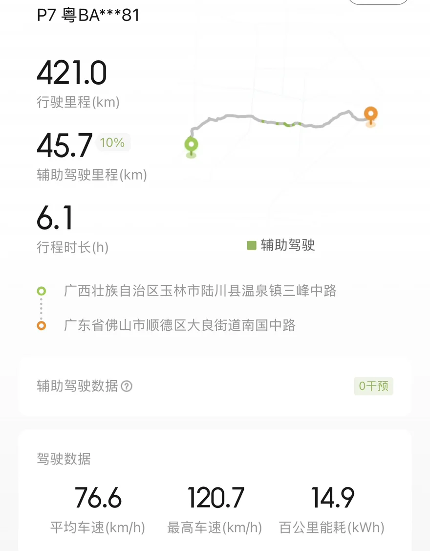 在App的行车记录上看,平均车速76.6km/h,最高速度120.7km/h,能耗是14.9kWh/100km。对于满载长途高速,这样的能耗和续航表现,我觉得还是挺满意的。也充分说明,13万公里的P7续航和能耗依然能打。