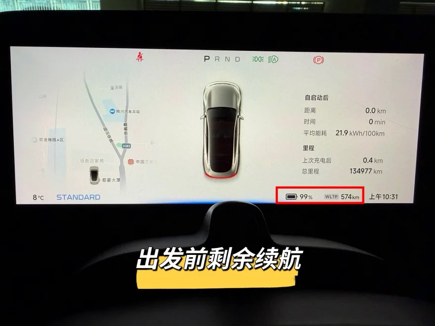 我的P7停放在自家车库内,车库内温度为8度,这个温度比较适宜,行驶过程中不需要开启空调,能够有效减少电量消耗,对续航表现更有利。出发前我对车辆进行了设置,将能量回收调整为低档位,驾驶模式选择标准模式,车上乘坐5人,属于满载状态。