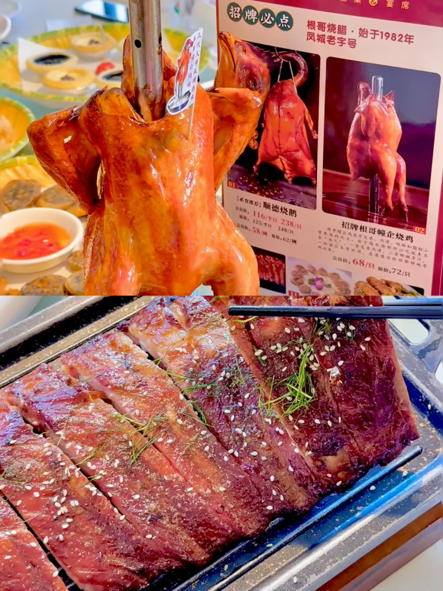 另外还点了幢企鸡,上桌造型很有特色,称得上“鹤立鸡群”。鸡肉外皮焦香,内里鲜嫩,烤制过程中不断流油,但入口并不会觉得油腻。我们直接徒手撕鸡,吃法简单直接,吃起来很有氛围。不过整体味道和我之前的期待有一点差距,口感不错,也是来顺德值得吃的一道菜。