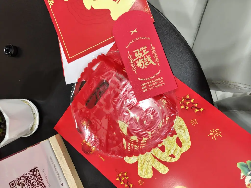 春节出行路上路过柳州小鹏东环店,充电的时候看到App上有免费检测服务,正好开了几百公里还要继续一千公里自驾,赶紧去测一下,这算是及时雨啊,这种贴心的服务太好了对了,还有新年进店礼包,就是春联福字什么的,虽不值钱但是心意到了,不错不错大家新年快乐,辛苦值守的工作人员啦