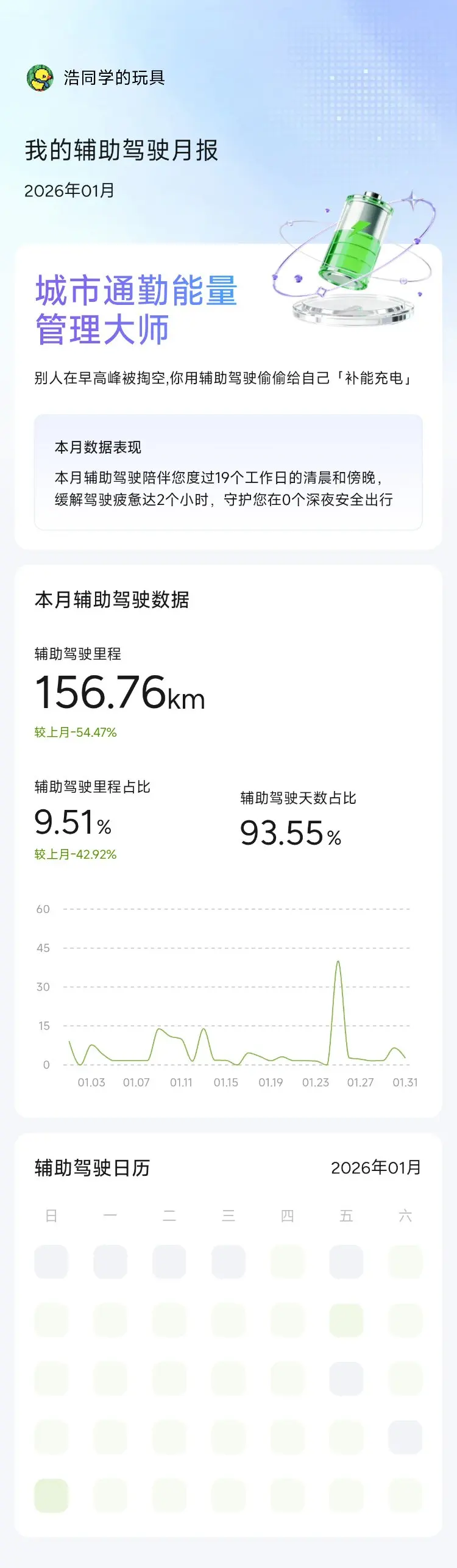 打开月报,1月156.76公里的辅助驾驶里程,93.55%的启用天数占比,数字背后是通勤路上的“偷懒”时刻:早高峰堵车时,它帮我稳稳跟车,省下2小时精力去改方案;晚高峰车流里,车道居中功能让双手短暂“休假”,抬头看见车窗外的晚霞,突然懂了“通勤能量管理大师”的含金量。