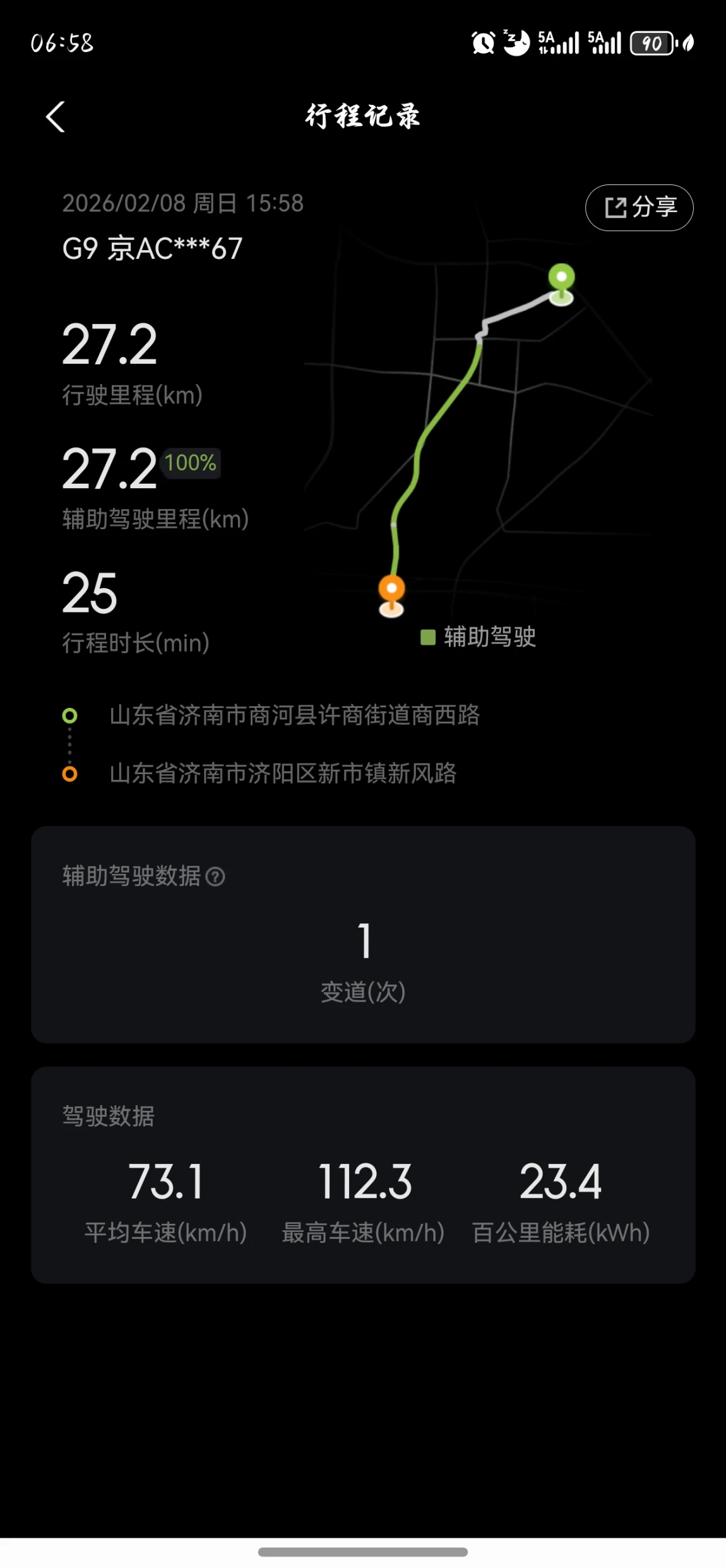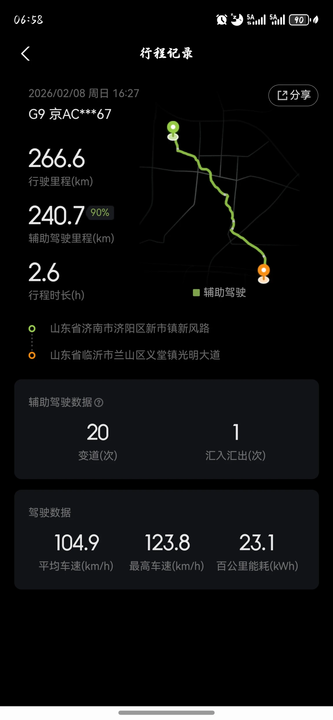 2.车多路况杂,它比我还稳济南到临沂那段路,车流量大,路况也复杂。266.6公里的路程,它就顶了240.7公里,接近90%。在车流里完成了20次精准变道,每次都果断又安全;高速汇入时,它还能提前预判后车,稳稳并入主路,那一瞬间,我真的觉得它比我自己开车还靠谱。