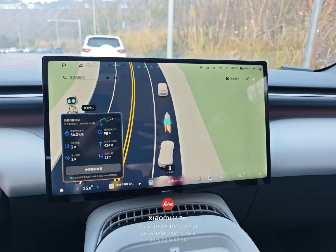 全程辅助驾驶占比高达98%,我少踩了434次电门和刹车,变道21次,手脚都得到了解放。