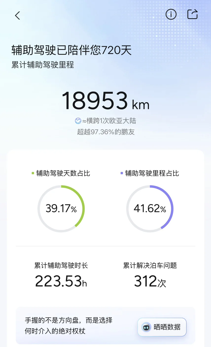 晒一波我的智驾战绩📊 辅助驾驶累计开了1.9万公里,超越97%的鹏友,整整223小时!相当于每天都靠小P省心,说它是我的“隐形副驾”一点不夸张~ 开着X9这台大空间MPV,满载一家人的行李和欢喜,全程舒舒服服,再也没有长途驾驶的疲惫感👇