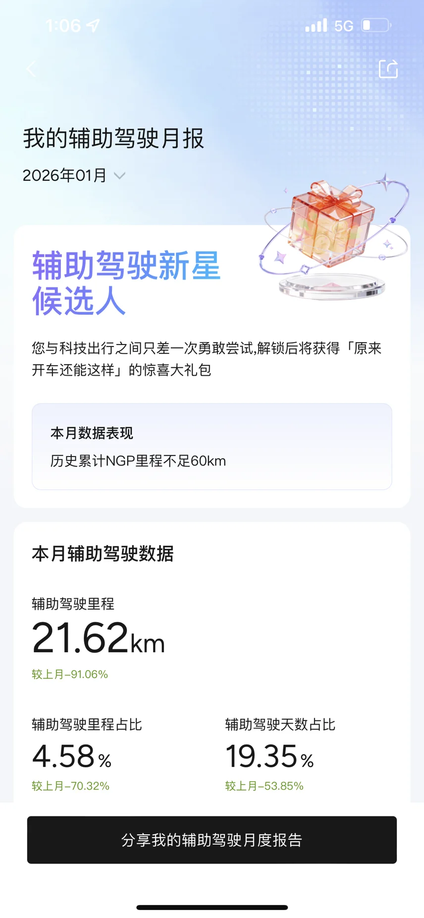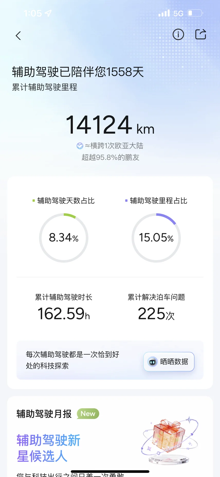 开了十万五千多公里 辅助驾驶也就用了将近1.5万公里。还是得多用 跑高速用得最多。像这回深圳返回潮汕 来回高速起码用个六七百公里了。