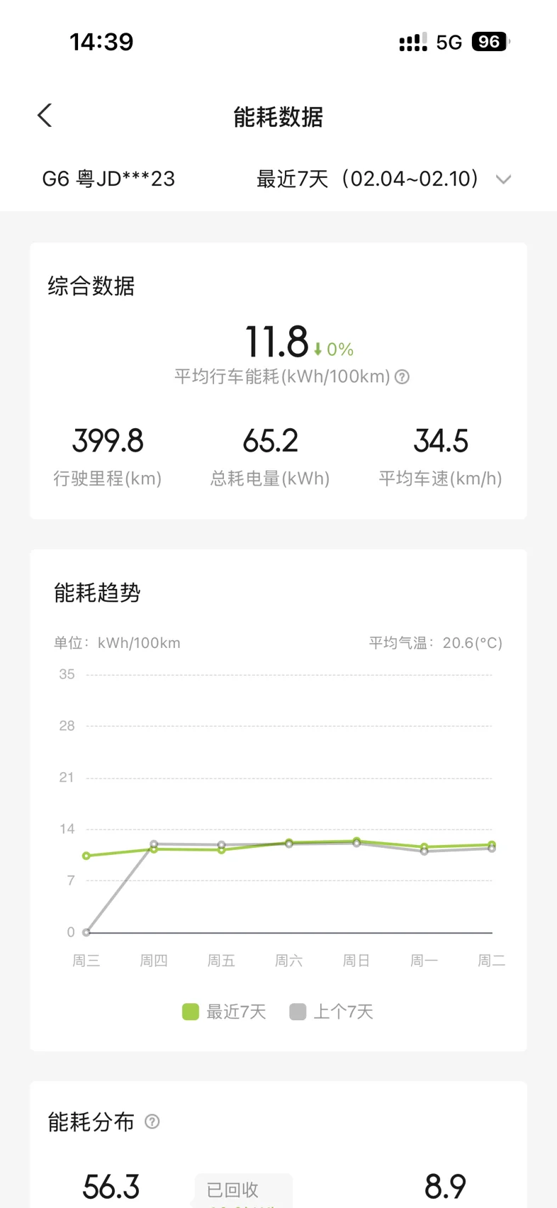 最近7天的能耗数据也格外亮眼:平均行车能耗11.8kWh/100km,行驶399.8公里,总耗电量65.2kWh,平均车速34.5km/h。在平均气温20.6℃的环境下,能耗表现稳定且高效,完美印证了小鹏G6的续航实力。无论是日常通勤还是短途出游,都能让我告别续航焦虑,满电出发,安心抵达。