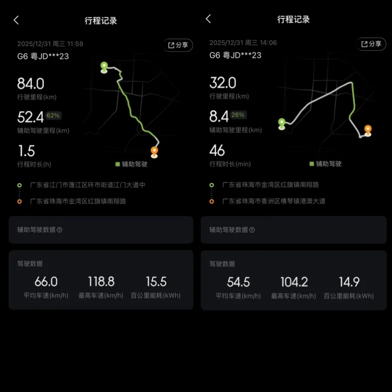 最让我印象深刻的,是那次从江门到珠海的84公里行程。全程辅助驾驶里程52.4公里,占比62%,平均车速66.0km/h,最高车速118.8km/h,百公里能耗仅15.5kWh。在这段旅程中,辅助驾驶不仅帮我应对了高速上的复杂路况,还在进入珠海市区后,精准识别了红绿灯和行人,让我在陌生的城市里也能游刃有余。而另一段从珠海金湾到香洲的32公里行程,辅助驾驶里程8.4公里,占比26%,平均车速54.5km/h,最高车速104.2km/h,百公里能耗14.9kWh,同样展现了出色的性能表现。
