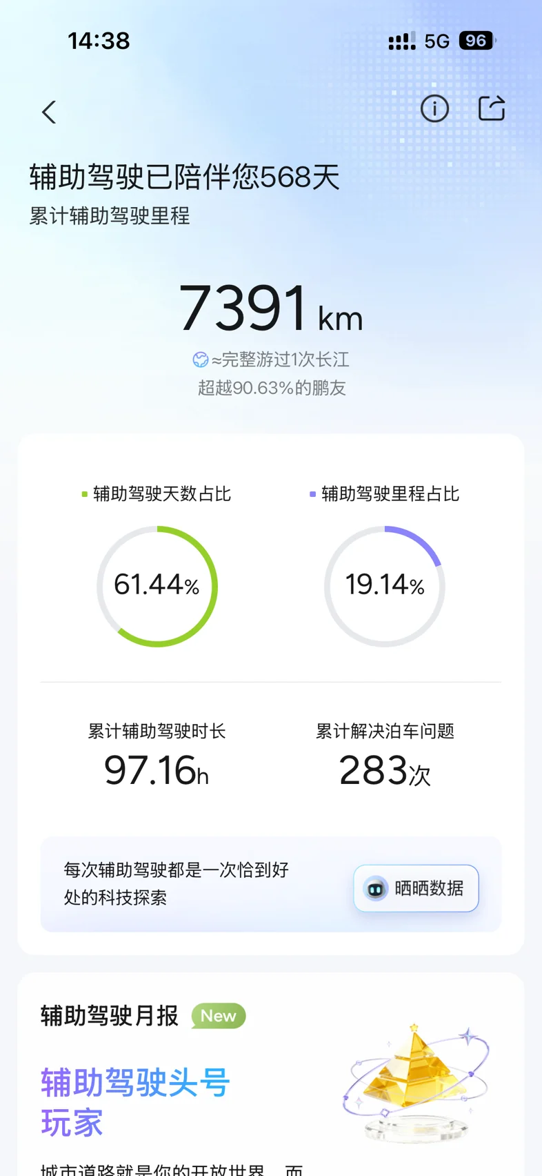 辅助驾驶天数占比61.44%,里程占比19.14%,累计时长97.16小时,还帮我解决了283次泊车难题。这些数字背后,是无数次在高速上解放双手双脚的轻松,是在城市拥堵路段从容应对的从容,更是在陌生停车场里一键泊车的省心。每次开启辅助驾驶,都像是开启了一段“恰到好处的科技探索”,让驾驶从一项任务,变成了一种享受。