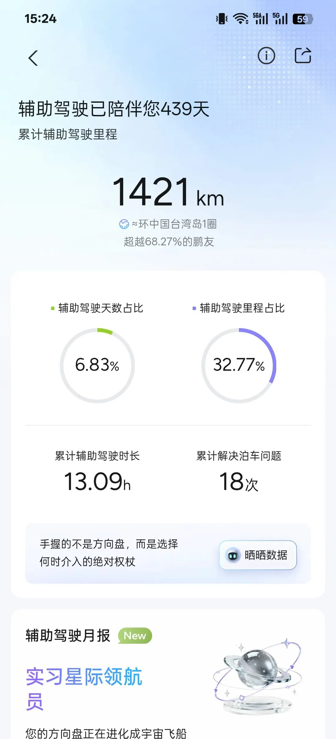 #我的辅助驾驶高光时刻# #开着小鹏回家过年# 谁懂啊!开小鹏P7+跑高速真的太爽了!439天,1421公里,高速NGP帮我解放了双手和大脑,自动泊车更是救了我的停车焦虑症。从“实习星际领航员”开始,我的智能驾驶之路才刚刚起步~1421公里,只是一个开始。我期待着未来,和我的小鹏P7+一起,解锁更多智能驾驶的新场景,让每一次出行都变得更轻松、更有趣。 毕竟,我的方向盘,正在进化成一艘探索未来出行的宇宙飞船🚀