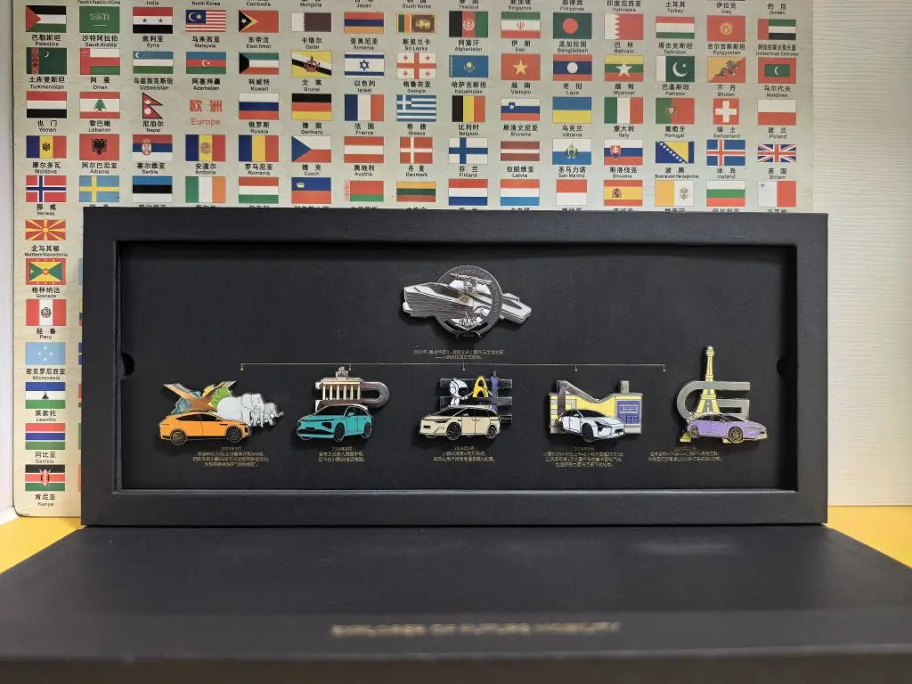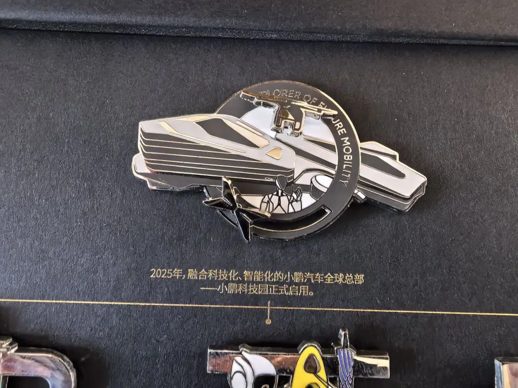 打开礼盒的那一刻,我被彻底惊艳了。六枚徽章以时间轴的形式排列,拼出了“XPENG”的字样,每一枚都对应着小鹏发展史上的关键节点,像一本立体的品牌编年史。