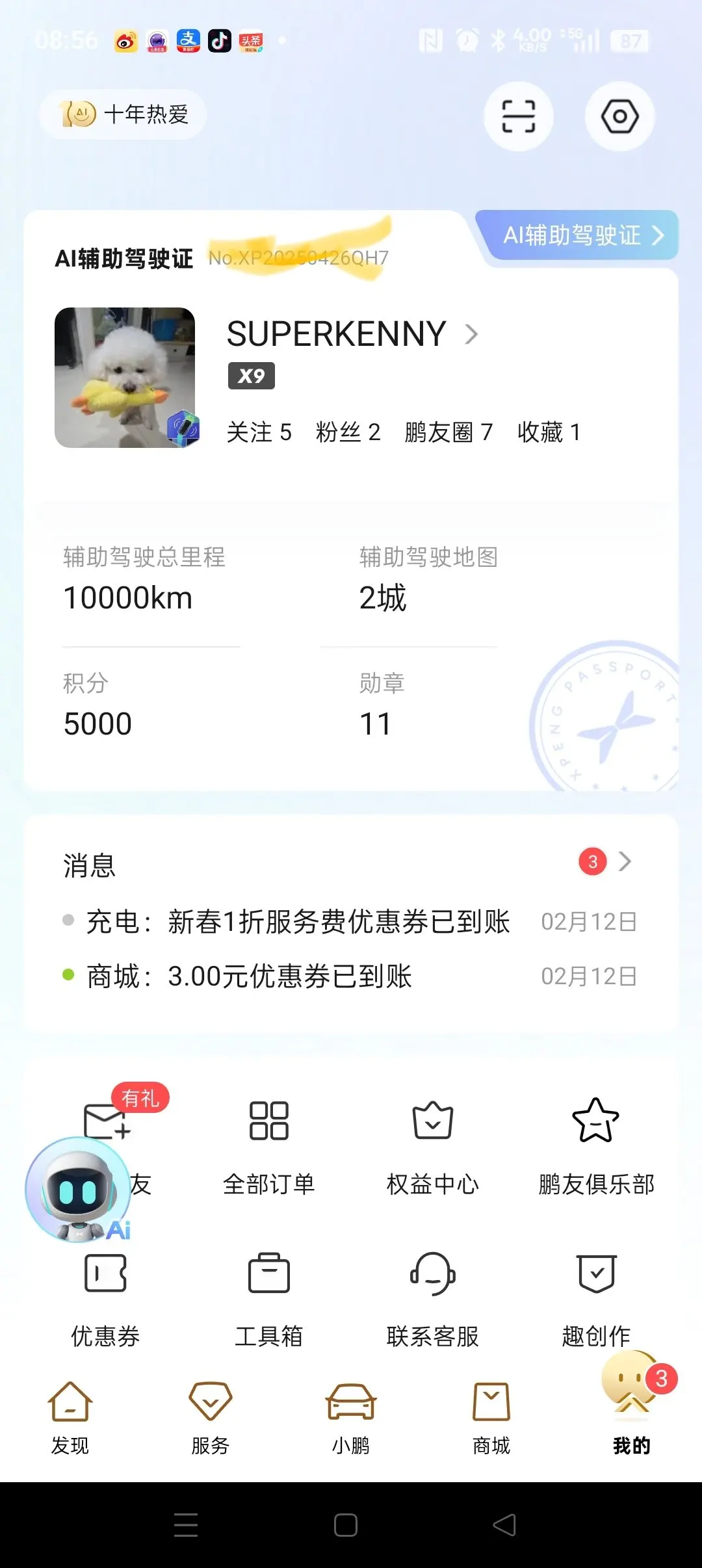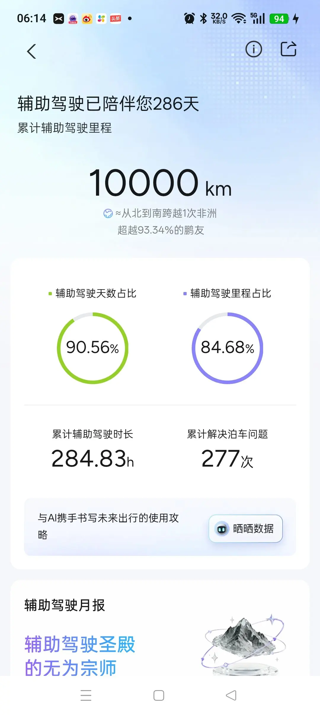 用车286天,总里程11829公里,智驾里程10000公里,智驾总占比84.68%。近3个月智驾总占比97%,单次行驶智驾占比100%是常态,这就是最真实的25款小鹏X9 740续航用户的用车感受。