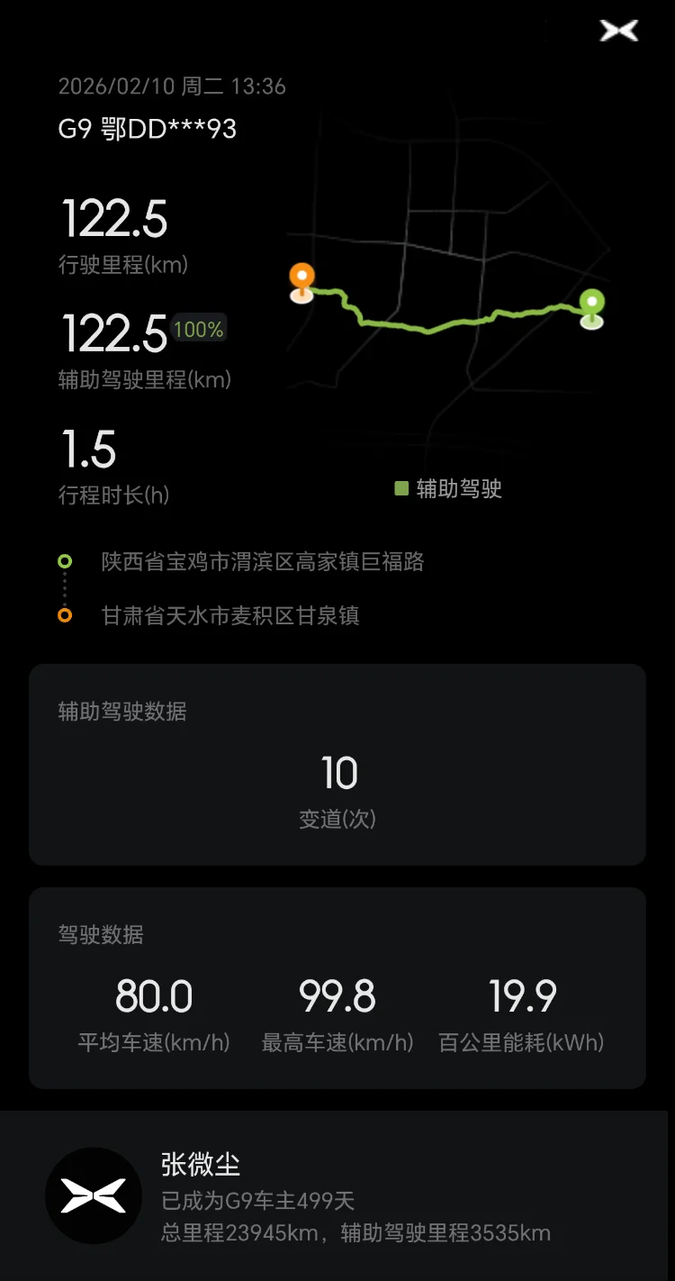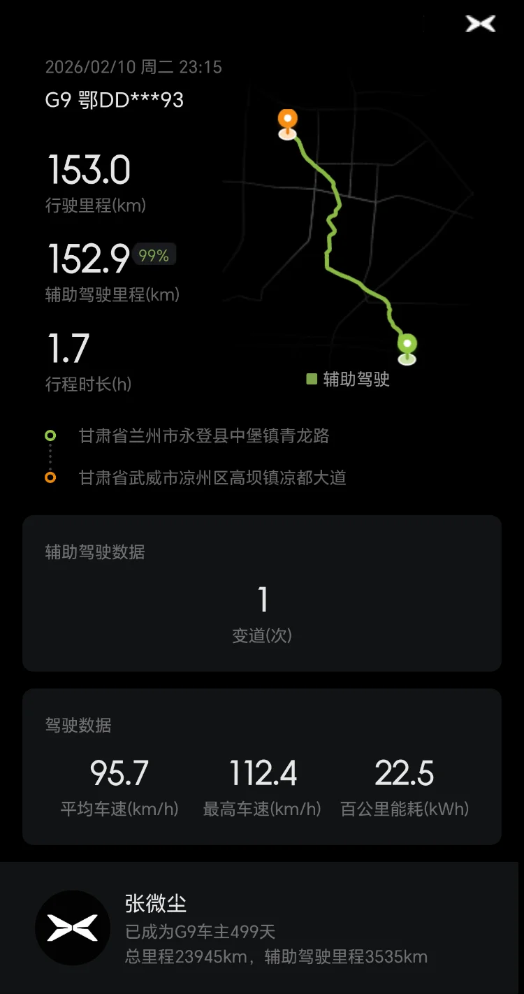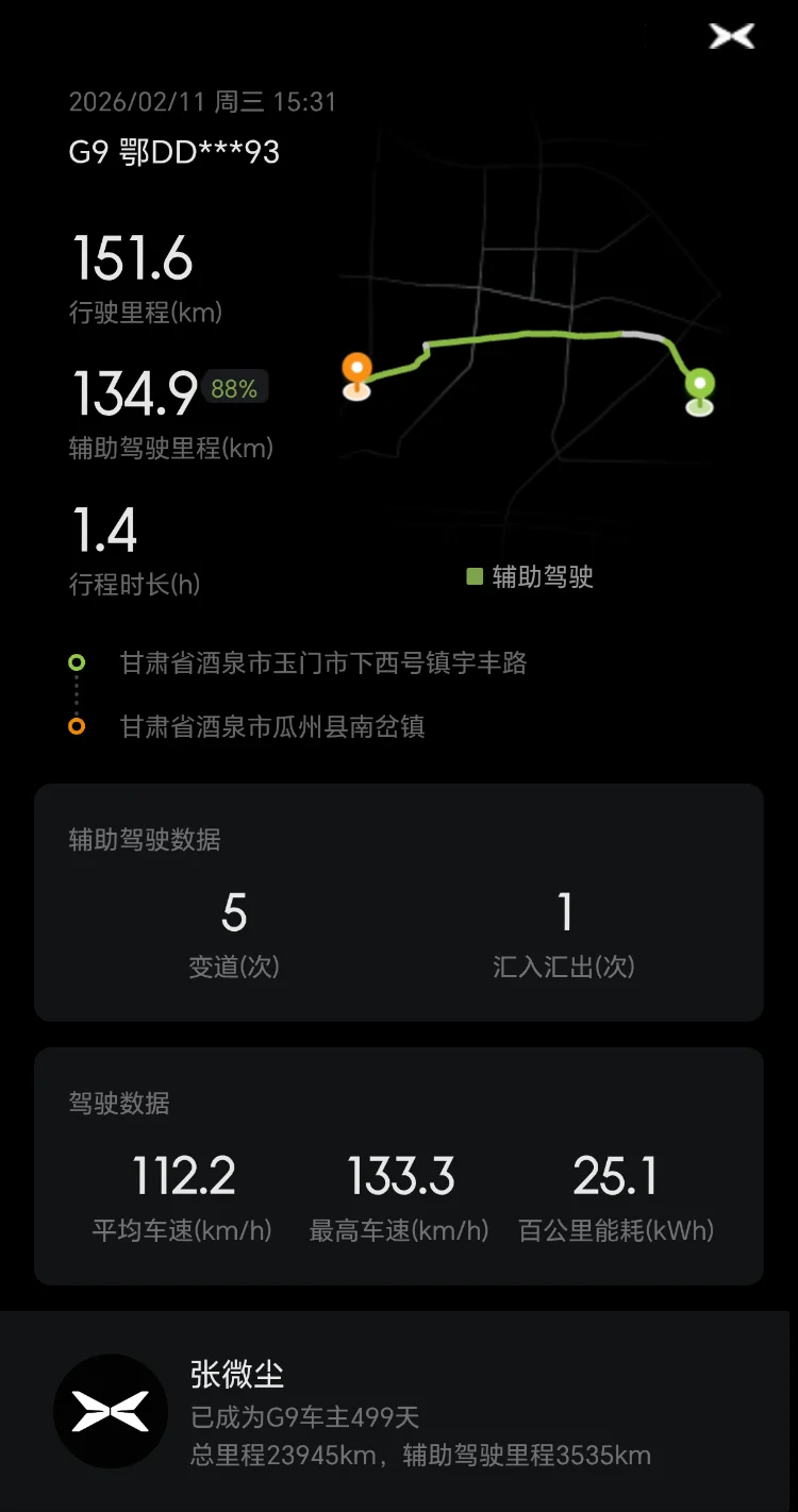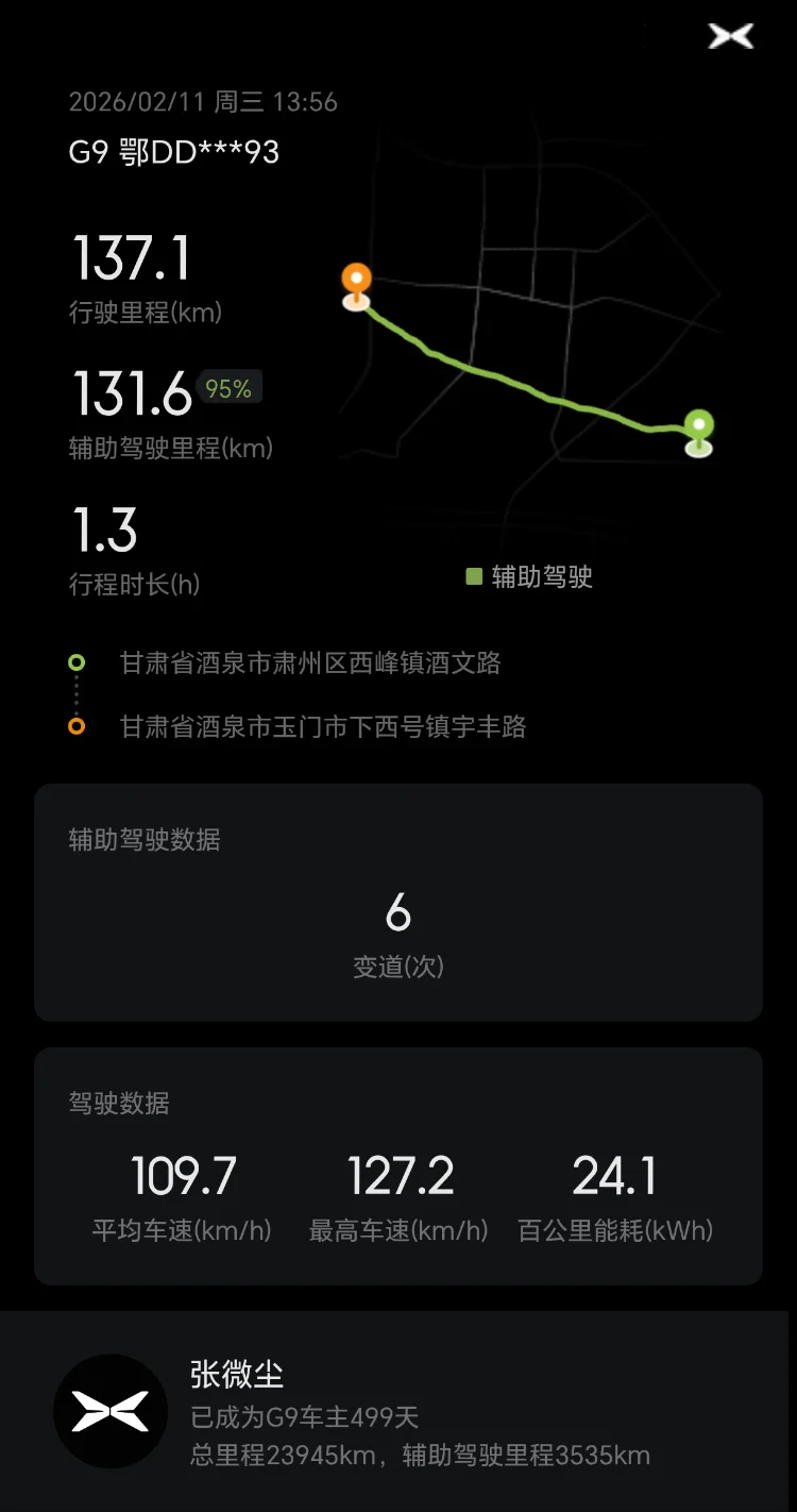 从湖北荆州到甘肃敦煌,全程两千多公里,小鹏G9全程护航,NGP最高达到100%,极大减轻驾驶疲劳,真心点赞!