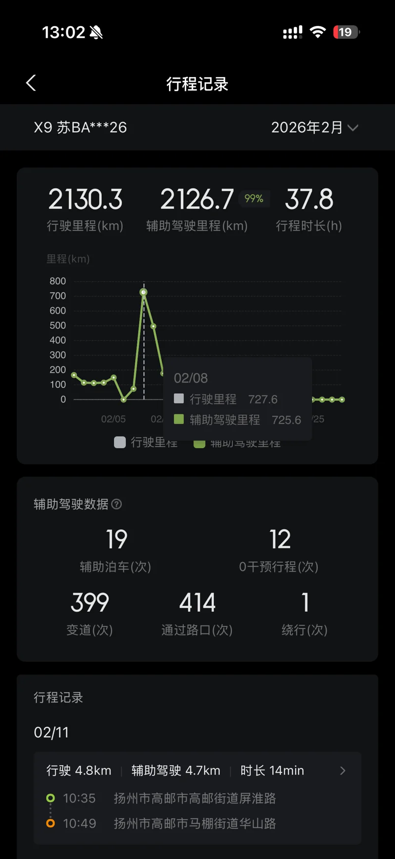单日最高行程727.6km,2月才过10天已经2100km多了,总NGP占比99.83%,辅助驾驶救我命……
