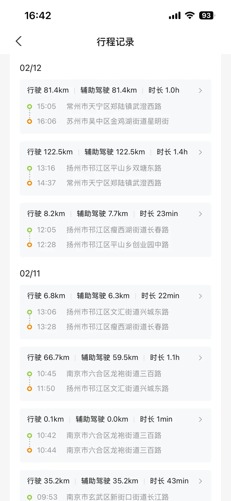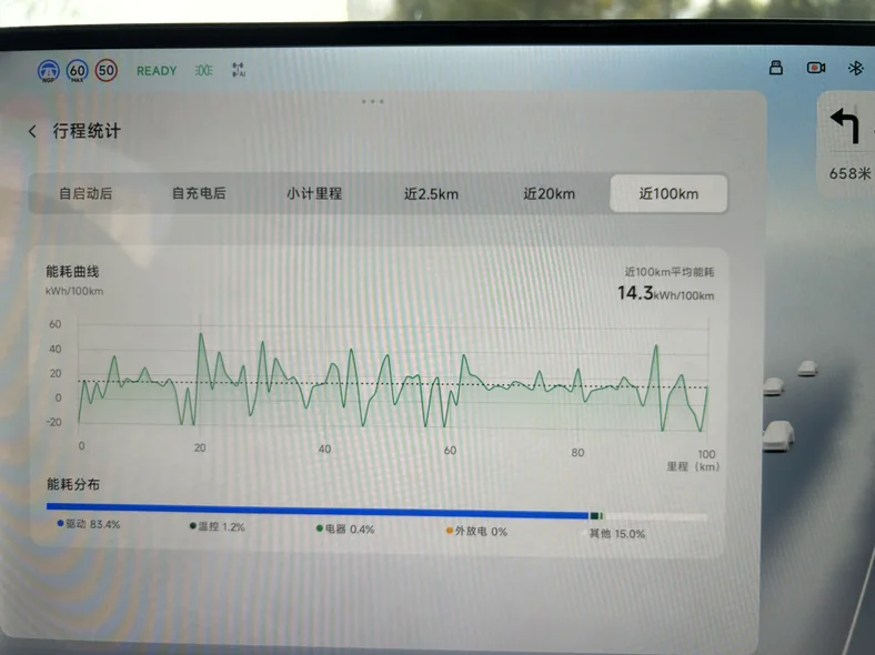 难得跑个小长途,高速智驾很安心,城区智驾也有小幅度提升。卡着限速100-126时速,全程205公里,用电从100%到62%,空调24座椅加热2档三个人,高速上电耗稳定在15.3左右,下高速后开了几公里,最终全程电耗在14.3。相当的满意。 对了 最近气温12左右。