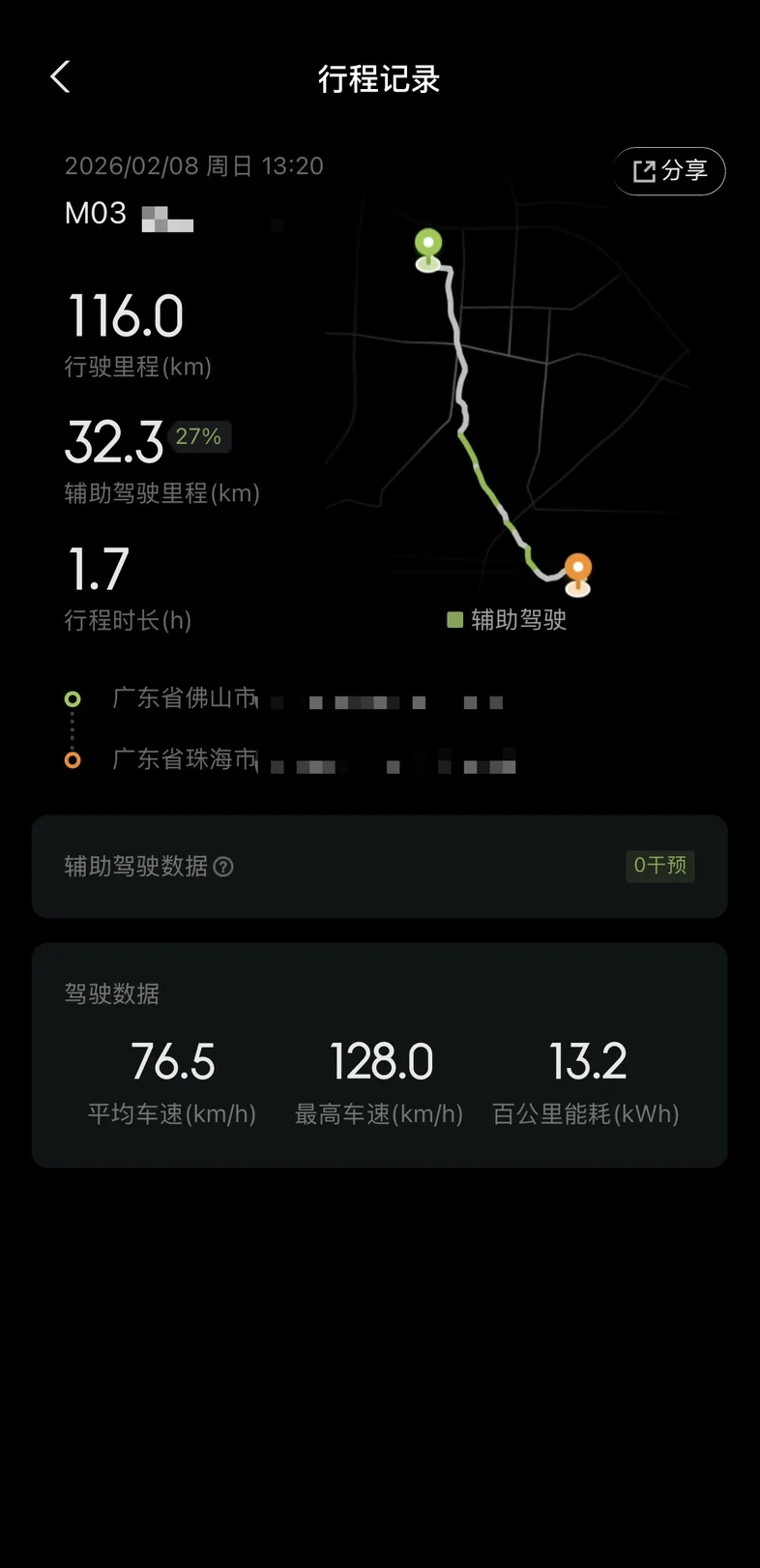 从佛山开回珠海,全程116km,辅助驾驶里程32.3km高速上LCC稳稳当当,解放双脚,让归途更轻松。有小鹏辅助驾驶的陪伴,回家的路不仅快,还更安心。这就是我的辅助驾驶高光时刻~#开着小鹏回家过年# #我的辅助驾驶高光时刻#